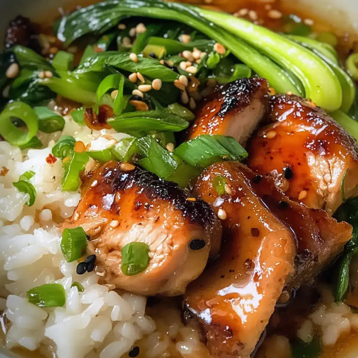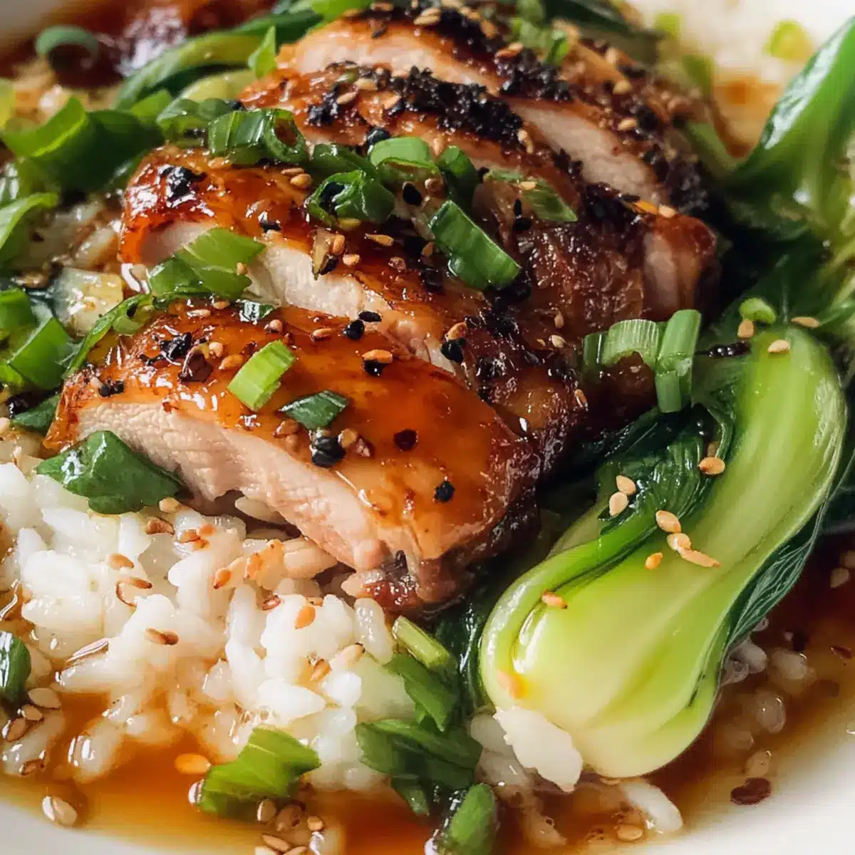 Den gekochten weißen Reis in Servierschüsseln verteilen. Die warme Brühe gleichmäßig über den Reis gießen und die in Scheiben geschnittenen Hähnchenschenkel sowie den angebratenen Bok Choy darauf anrichten.