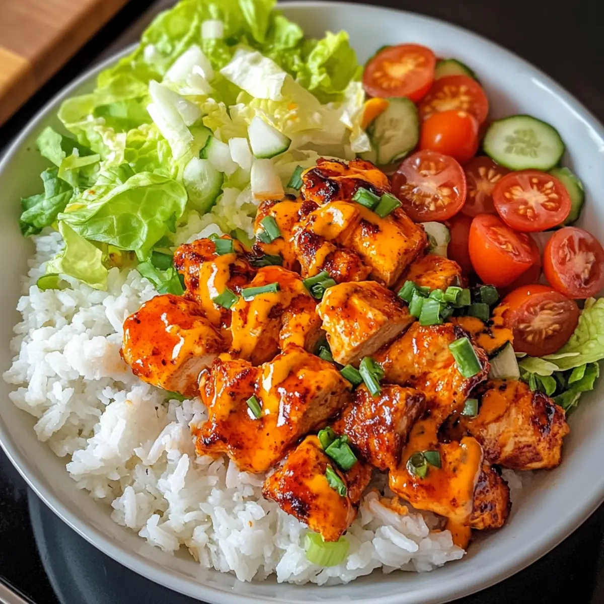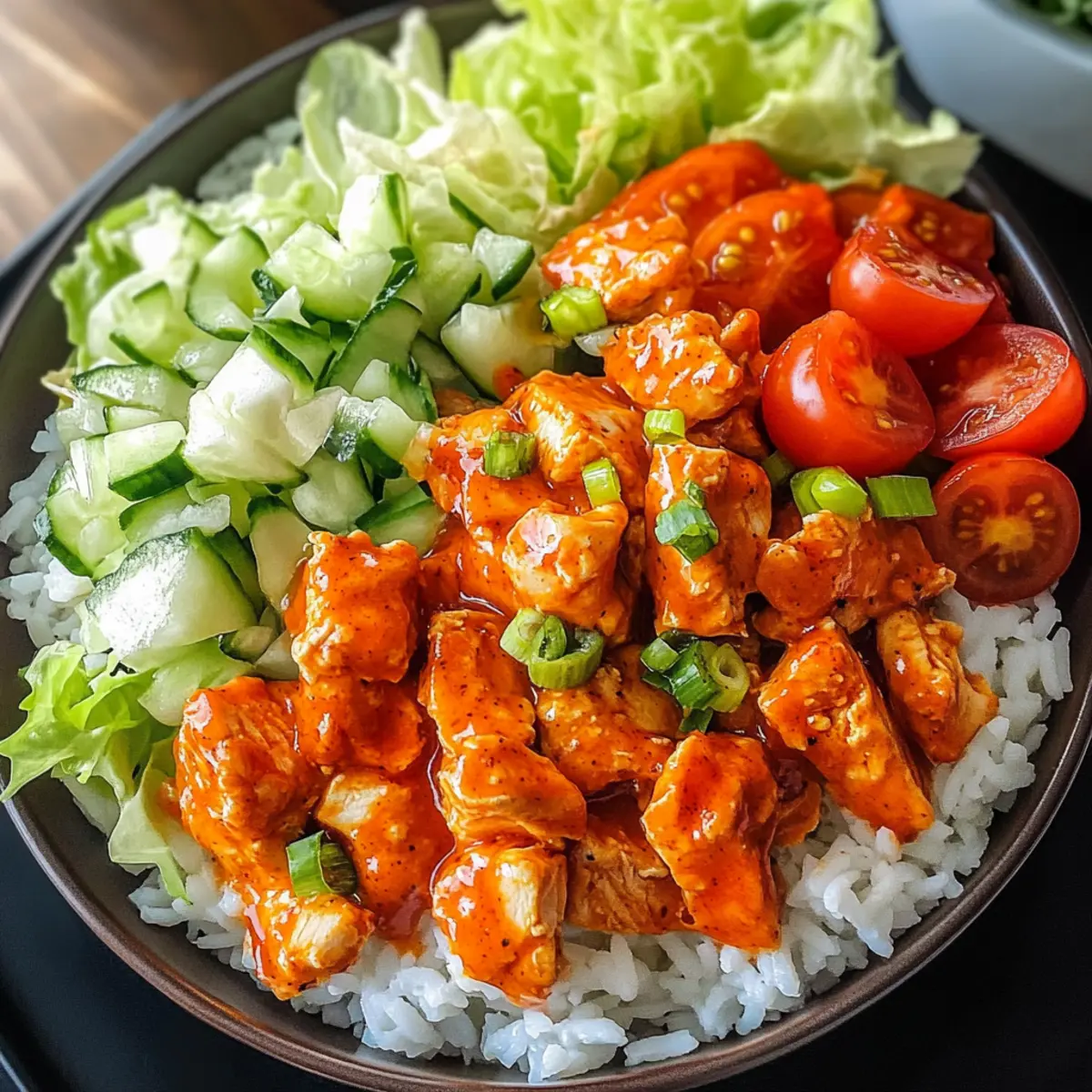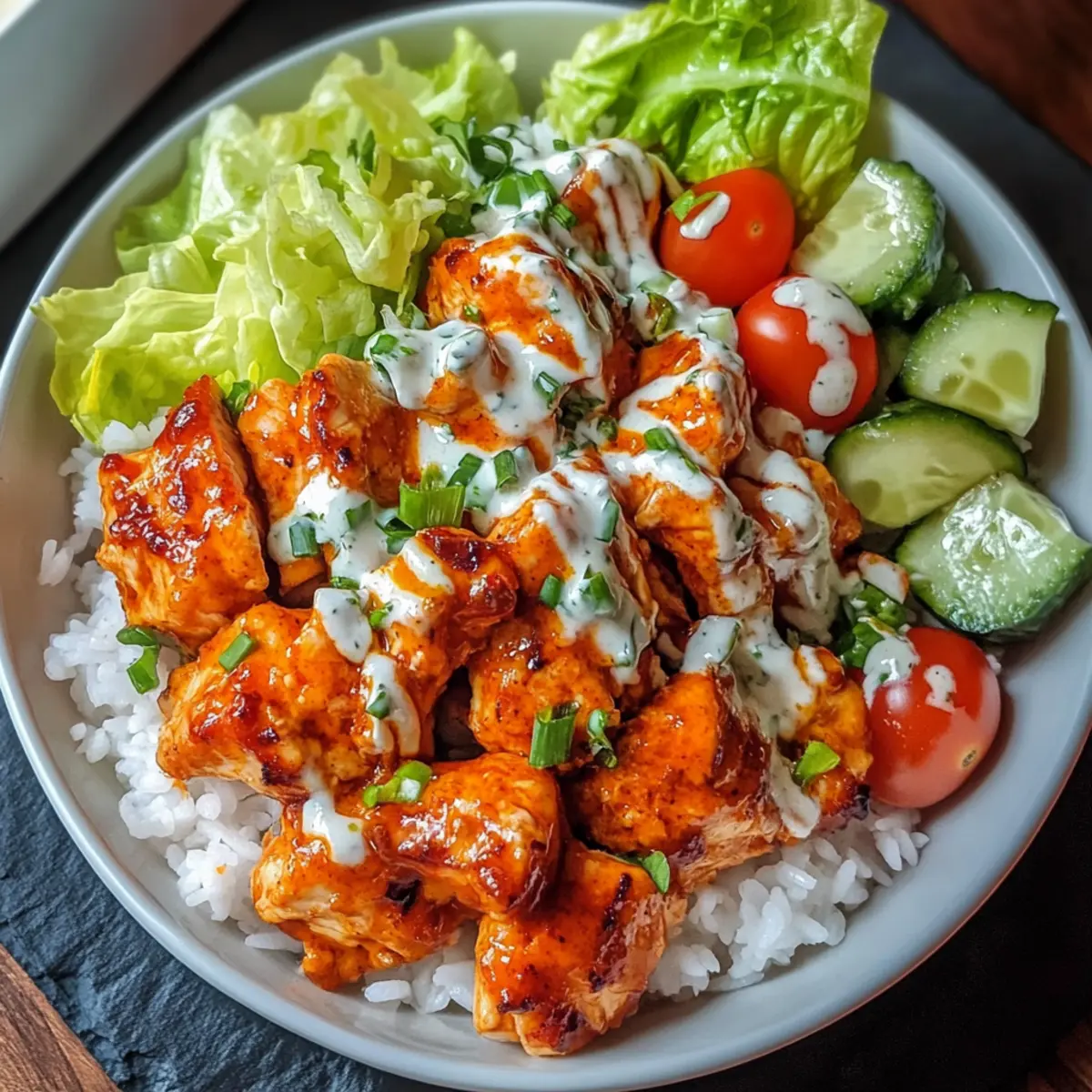 - Gemüse hinzufügen: Lege das Buffalo-Hähnchen auf den Reis und füge geriebenen Salat und halbierte Kirschtomaten hinzu.