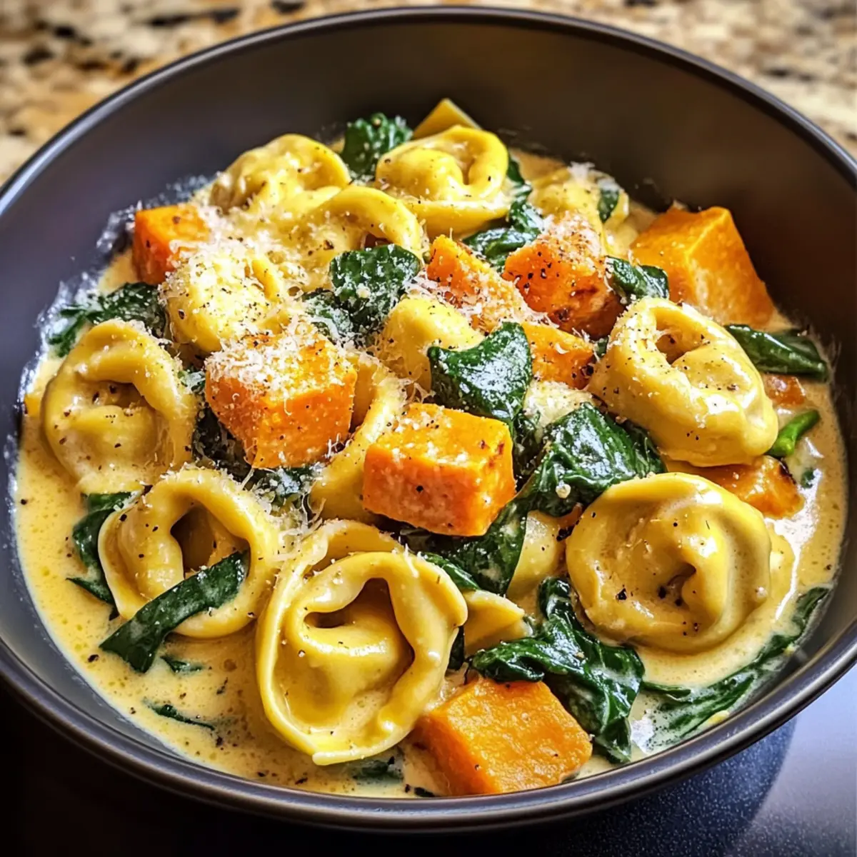 Cremige Pfannen-Tortellini mit Süßkartoffel und Spinat