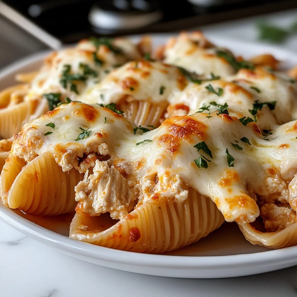 Knoblauchbutter-Hühnchen-Alfredo Muscheln für Feinschmecker