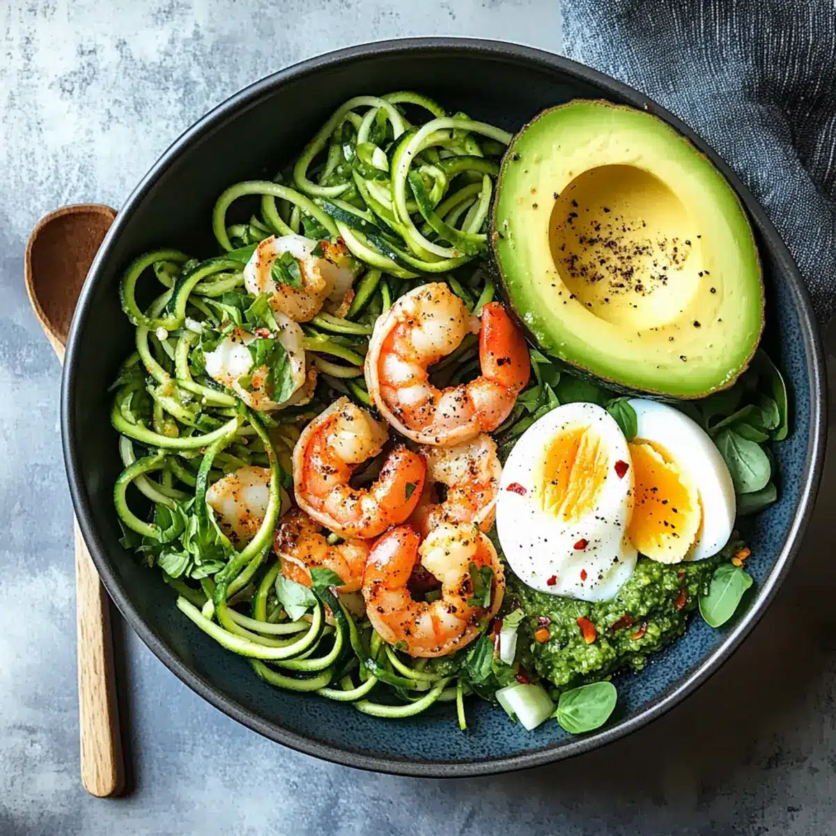 Zoodle-Schüssel mit gegrillten Garnelen und Pesto