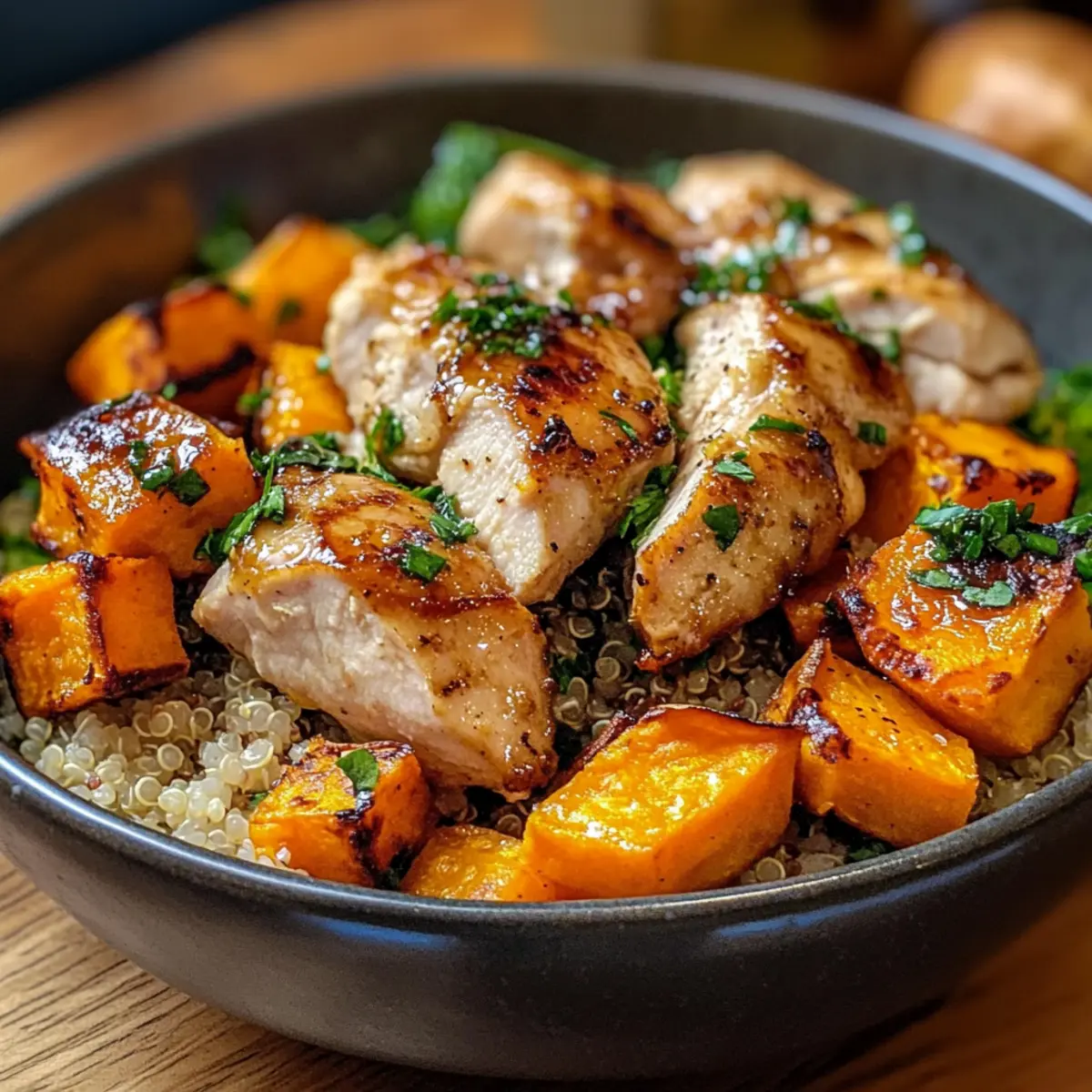 Ahorn-Dijon-Hühnchen und geröstete Süßkartoffeln