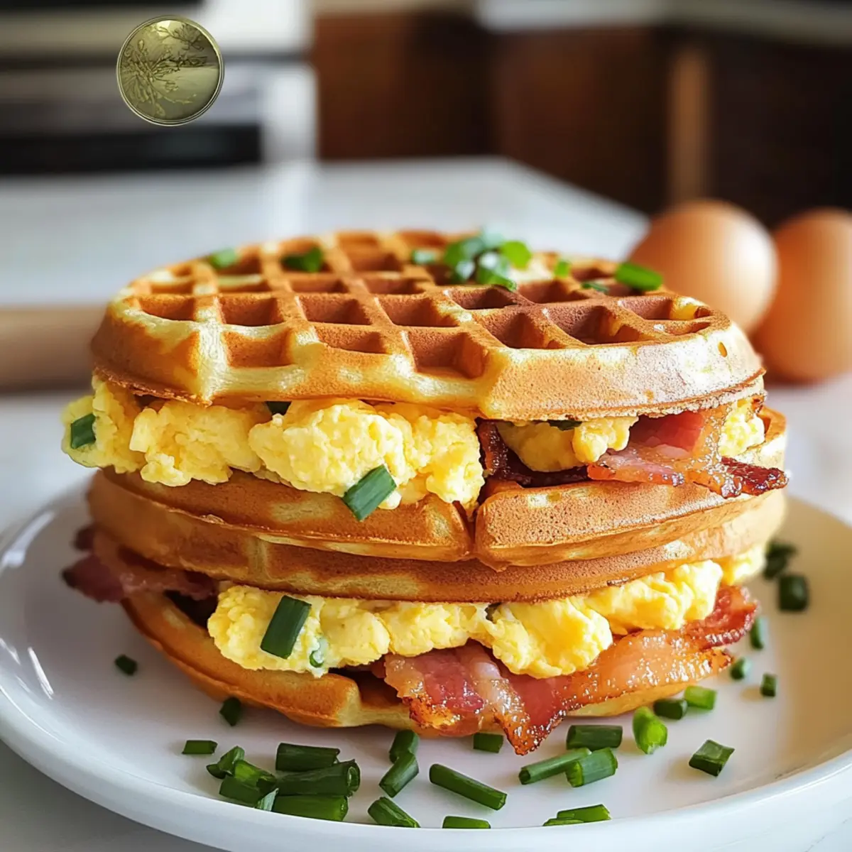 - Auf einer Waffel die Schnittlauch-Mayo gleichmäßig verstreichen, dann die Rühreier, den knusprigen Speck und eventuell Avocadoscheiben darauflegen.