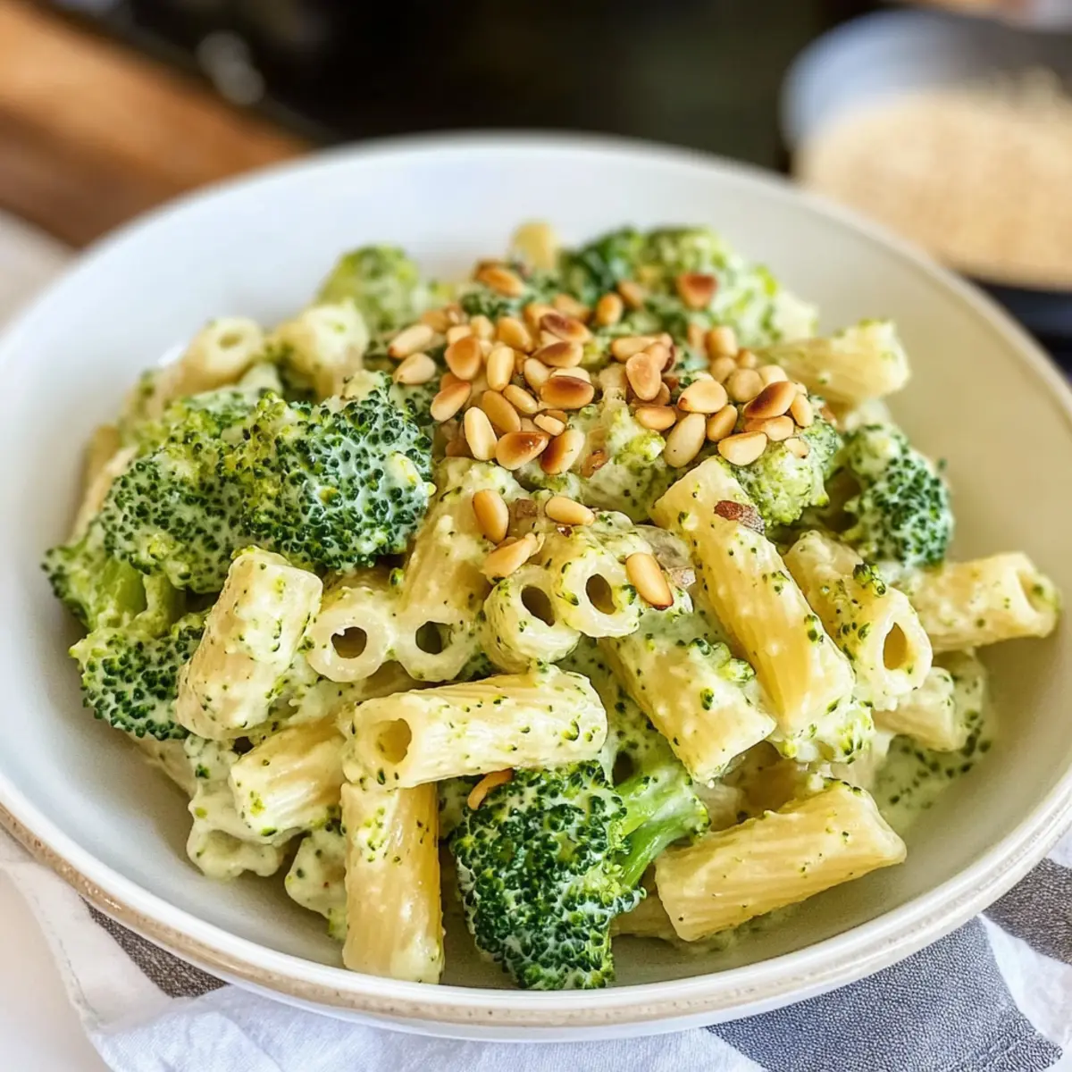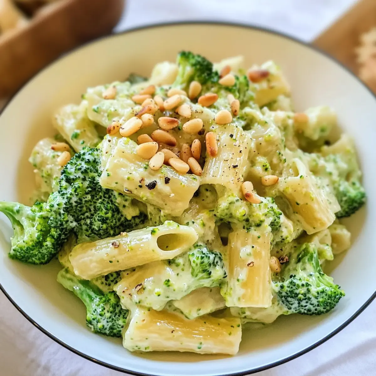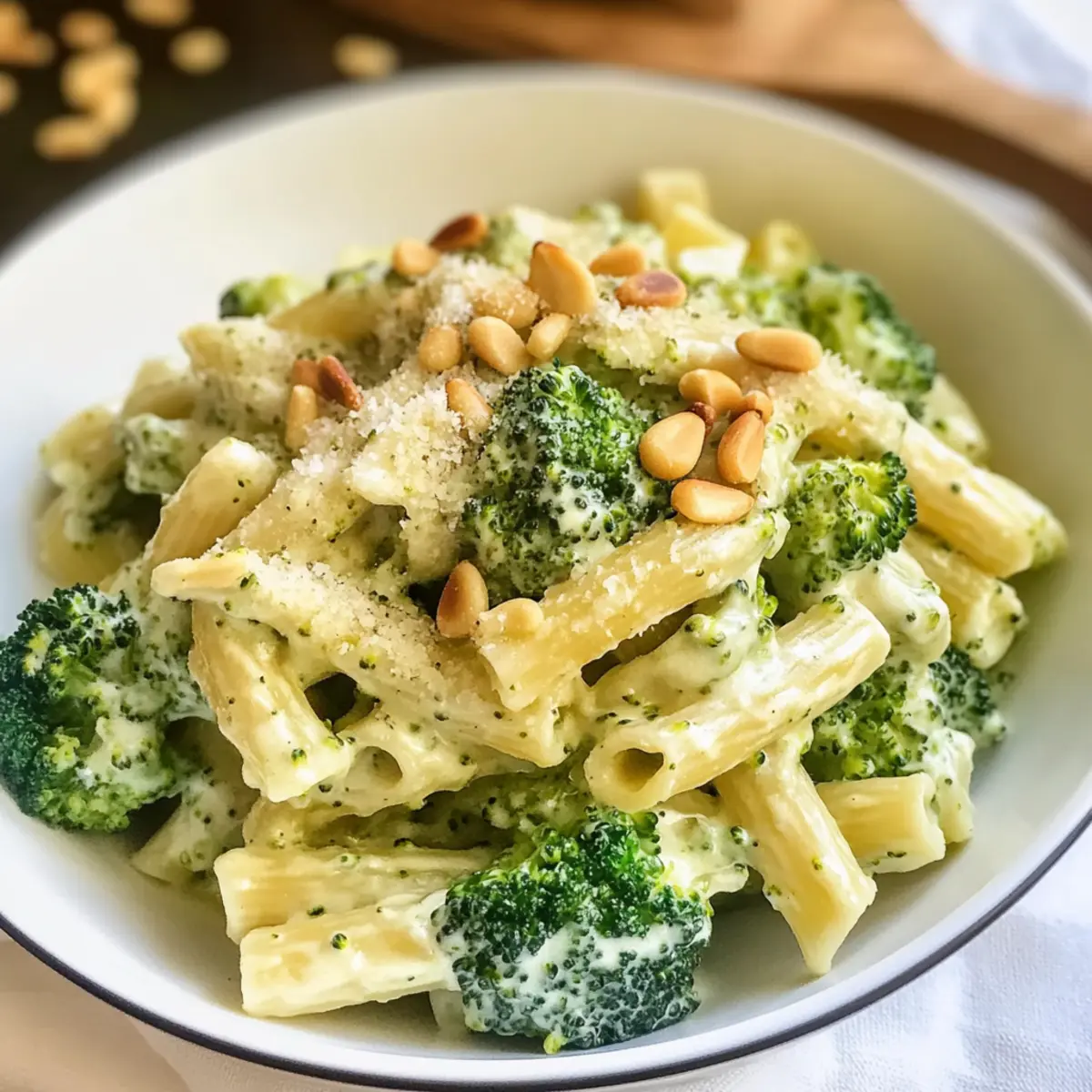 Geben Sie die abgetropften Nudeln in die Sauce und vermengen Sie alles gründlich, sodass die Nudeln gleichmäßig mit der cremigen Brokkoli-Sauce überzogen sind. Lassen Sie das Ganze für 1–2 Minuten auf niedriger Hitze ziehen, damit sich die Geschmäcker gut verbinden. Servieren Sie das Gericht heiß und garnieren Sie es mit den gerösteten Pinienkernen.