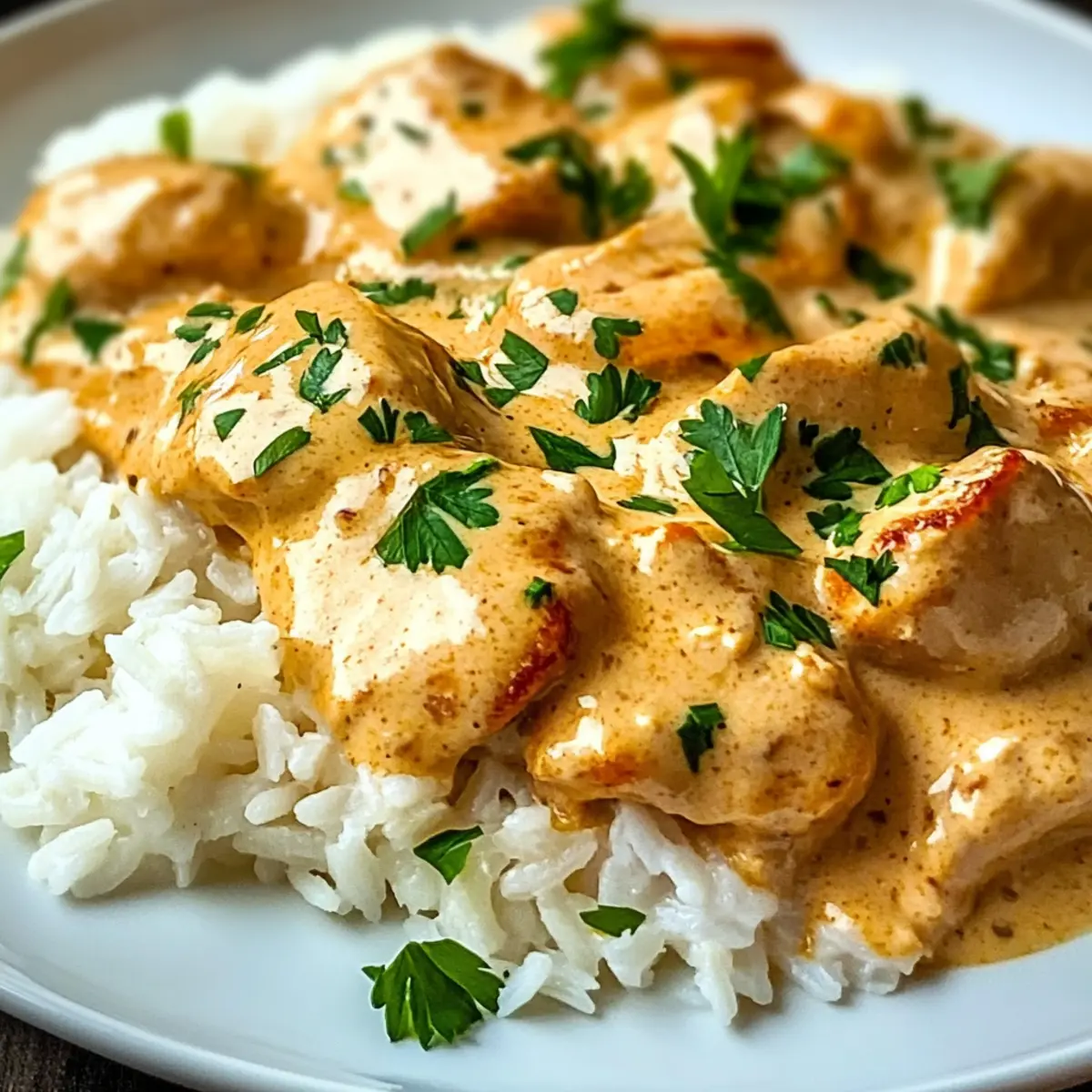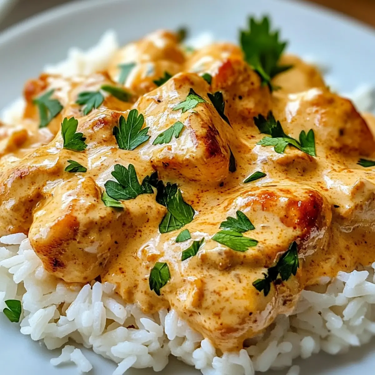 - Verteile den Reis auf Tellern, lege das Hähnchen darauf und löffle die Sauce darüber. Mit Petersilie garnieren.