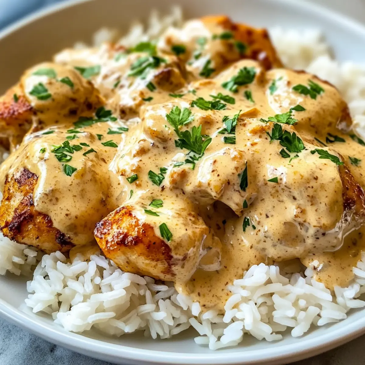 Verteile den aufgeflufften Reis auf Teller und lege das smothered Hähnchen darauf. Löffle großzügig die restliche Sauce über das Hähnchen und garnieren es mit frischer Petersilie für einen farbenfrohen Akzent. Serviere die cremige überbackene Hühnchen und Reis heiß und genieße das herzliche Gericht mit Familie und Freunden!