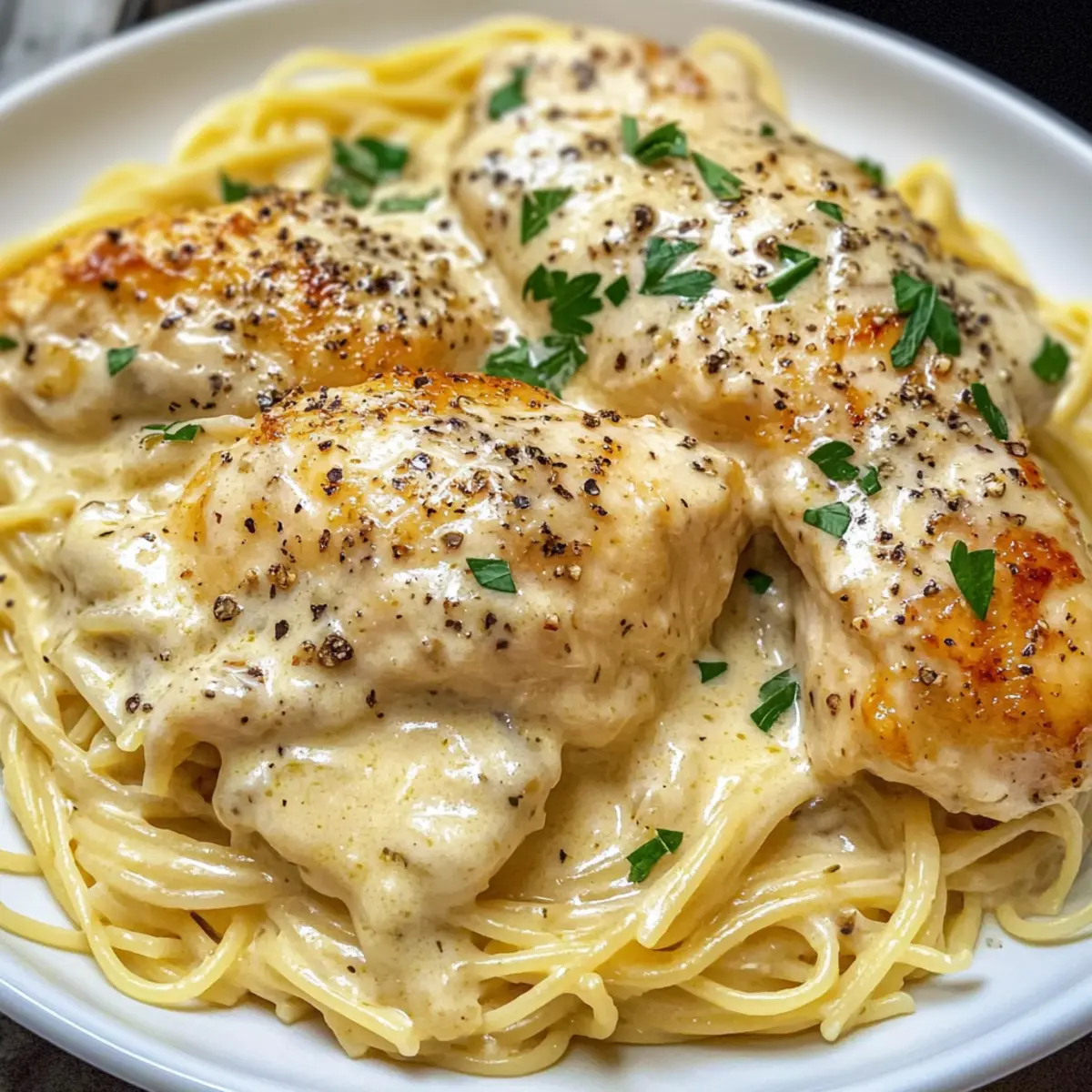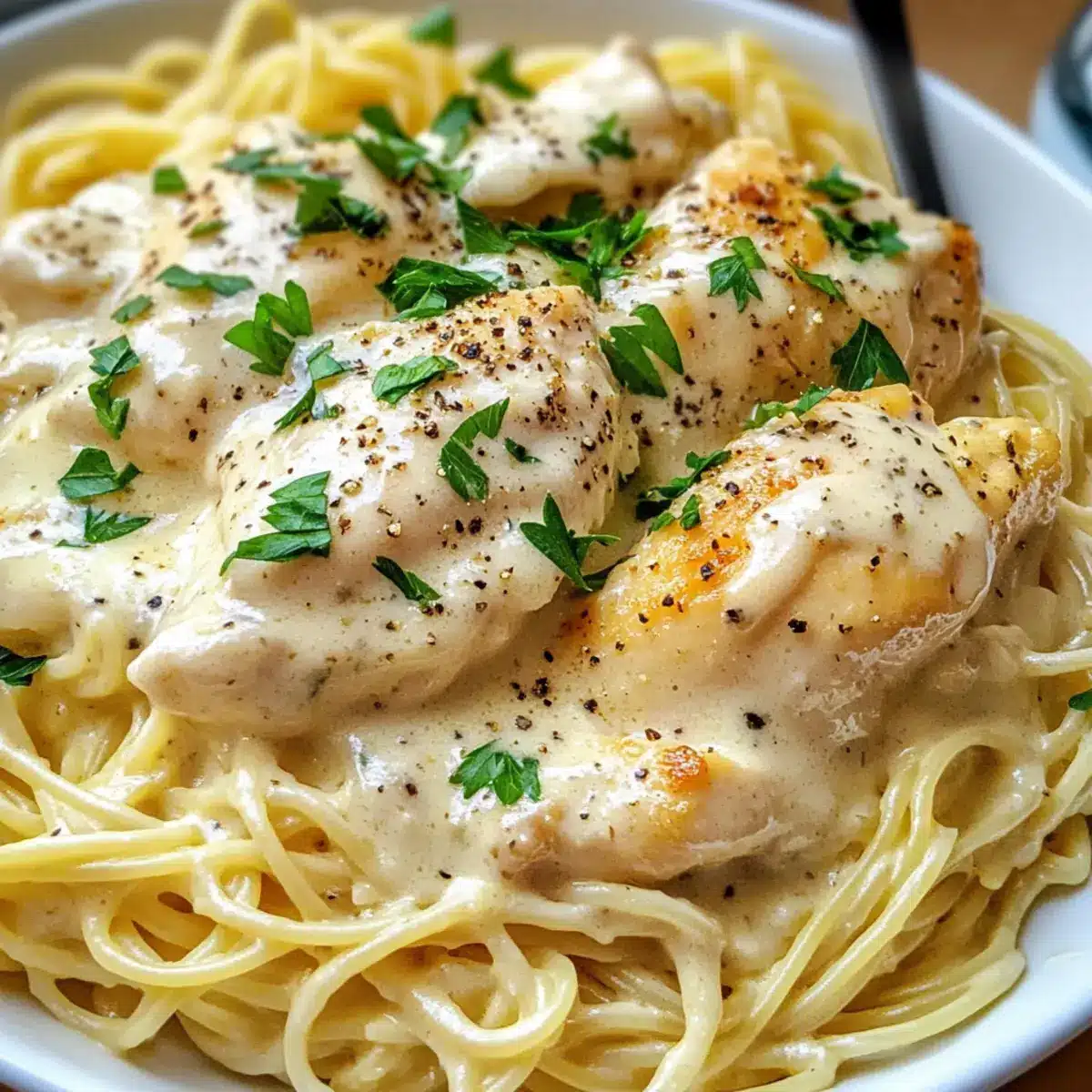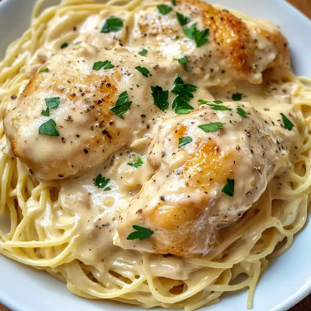- Servieren Sie das zarte Hähnchen über den frisch gekochten Engelshaartagen und löffeln Sie die cremige Sauce großzügig darüber. Verfeinern Sie das Gericht mit frisch gehackter Petersilie, zerstoßenem Pfeffer und geriebenem Parmesan.