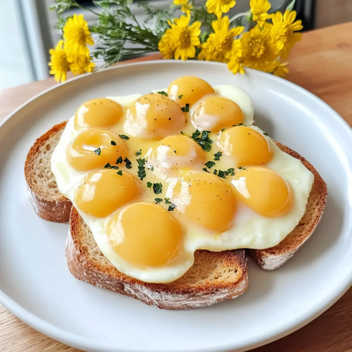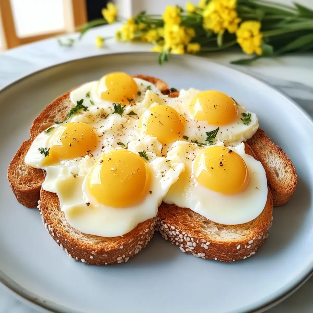 Löffle die cremige Eiersoße über die gerösteten Brotscheiben, sodass sie großzügig bedeckt sind. Füge nach Belieben frische Kräuter oder Gewürze hinzu, um den Geschmack zu verfeinern. Die Eier nach Goldgrund sind nun bereit, serviert zu werden!