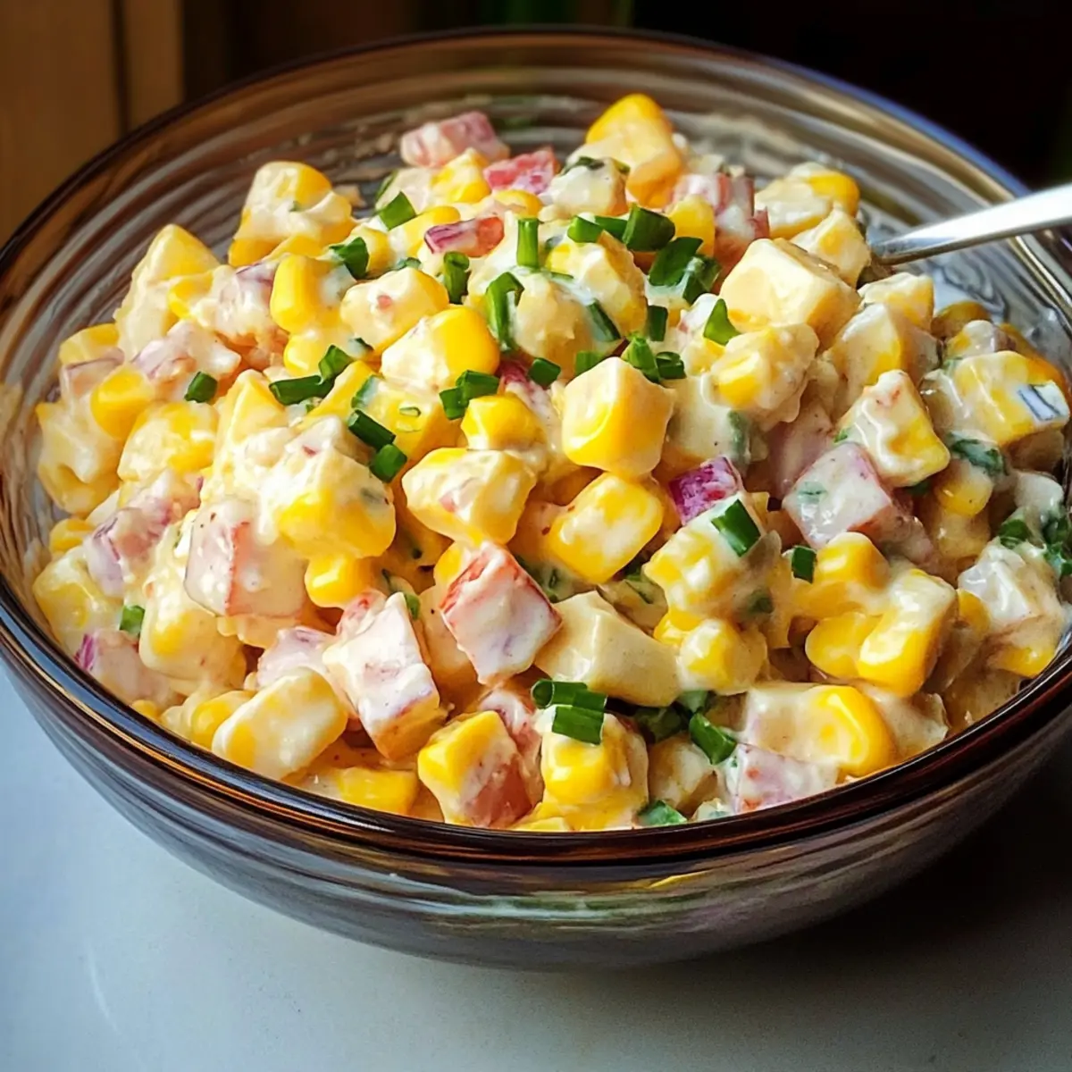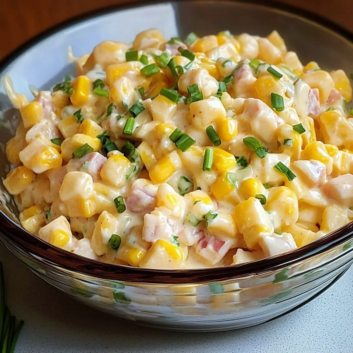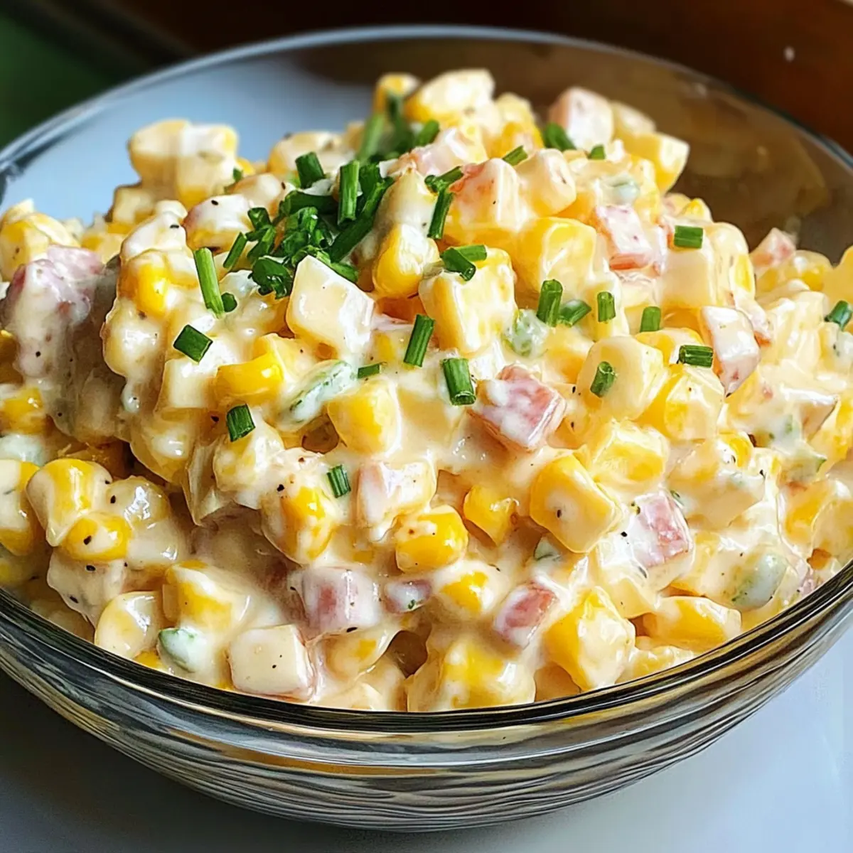 Erfrischend und lecker: Der Ess mich Dumm Salat ist die perfekte Mischung aus süßem Mais, herzhaftem Kochschinken und cremigem Edamer Käse – ein Gaumenschmaus für jeden Anlass!