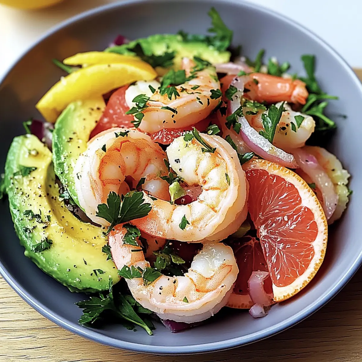 - Nimm eine große Schüssel und gib die gewürfelte Avocado, die Grapefruitsegmente, die Garnelen, die fein geschnittene rote Zwiebel und die gehackte Petersilie hinein.