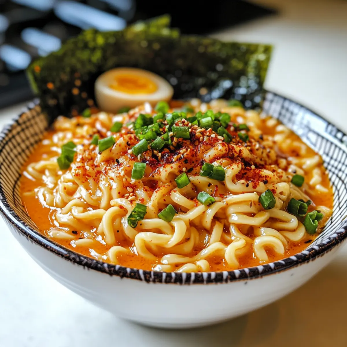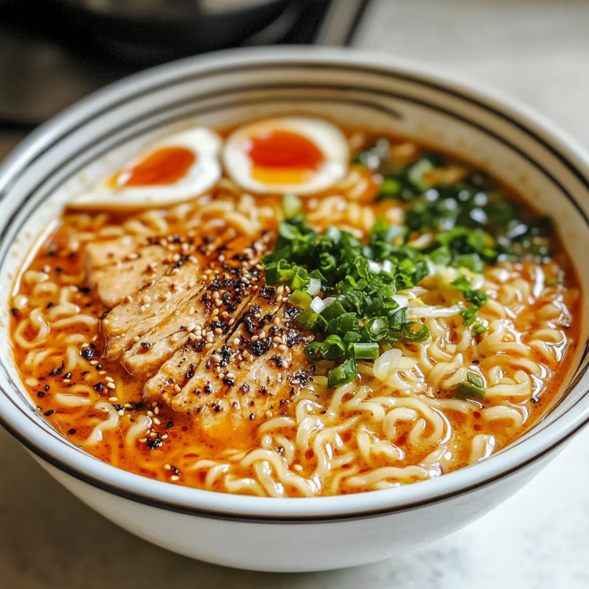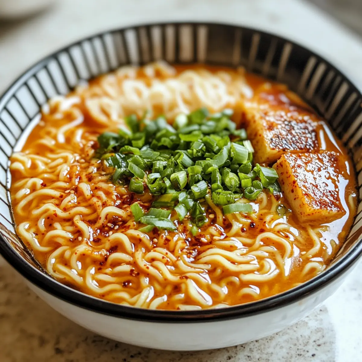 Einfachheit: Mit nur wenigen Zutaten und einfachen Schritten ist dieses Rezept perfekt für alle Kochlevel. Würziger Kick: Die Kombination aus scharfem Chili und frischem Knoblauch sorgt für ein aufregendes Geschmackserlebnis. Cremige Textur: Die schwere Sahne verleiht der Sauce eine samtige Konsistenz, die wunderbar zu den Ramen passt. Vielseitigkeit: Du kannst nach Belieben mit Gemüse oder Proteinvarianten wie Hähnchen oder Tofu experimentieren, um deine eigene Note zu setzen. Schnell zubereitet: In weniger als 30 Minuten kannst du ein köstliches Gericht auf den Tisch bringen – perfekt, wenn die Zeit drängt. Diese überraschende Mischung aus Einfachheit und Geschmack macht die feurigen Hühnchen-Ramen zu einem Muss für dein nächstes Abendessen!