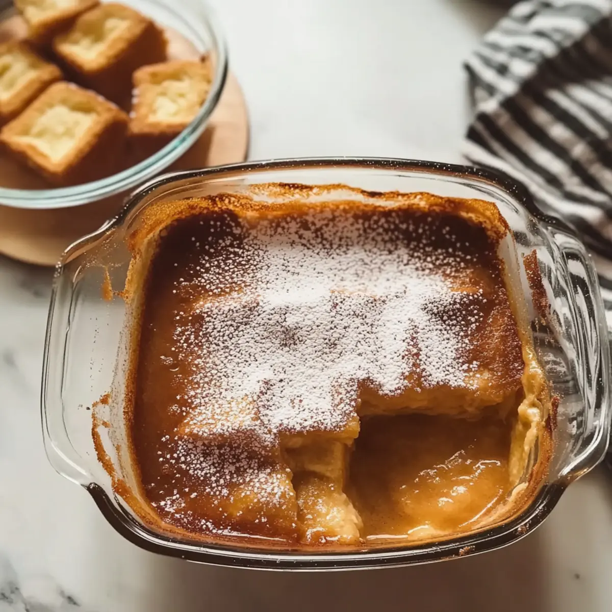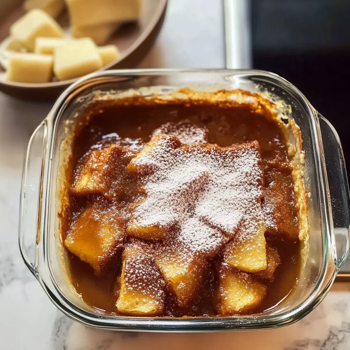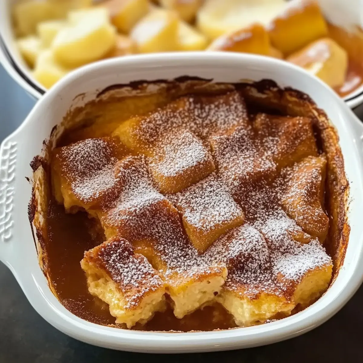 Falls gewünscht, siebe etwas Puderzucker über die fertige Französische Toast Casserole, um sie festlich zu dekorieren. Serviere das Gericht warm, vielleicht mit frischen Früchten oder etwas Ahornsirup. Genieße das Geschmackserlebnis mit Familie und Freunden!