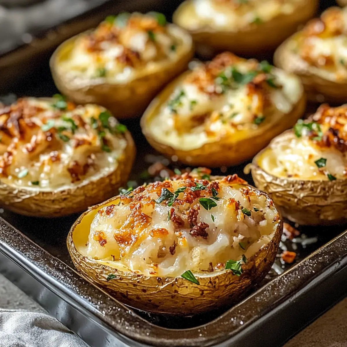 Fülle die ausgehöhlten Kartoffeln großzügig mit der vorbereiteten Mischung. Achte darauf, dass die Füllung gut sitzt und die Schalen gefüllt sind. Platziere die gefüllten Kartoffeln zurück auf das Backblech und backe sie bei 180°C für 10–15 Minuten, bis der Käse geschmolzen und leicht gebräunt ist.
