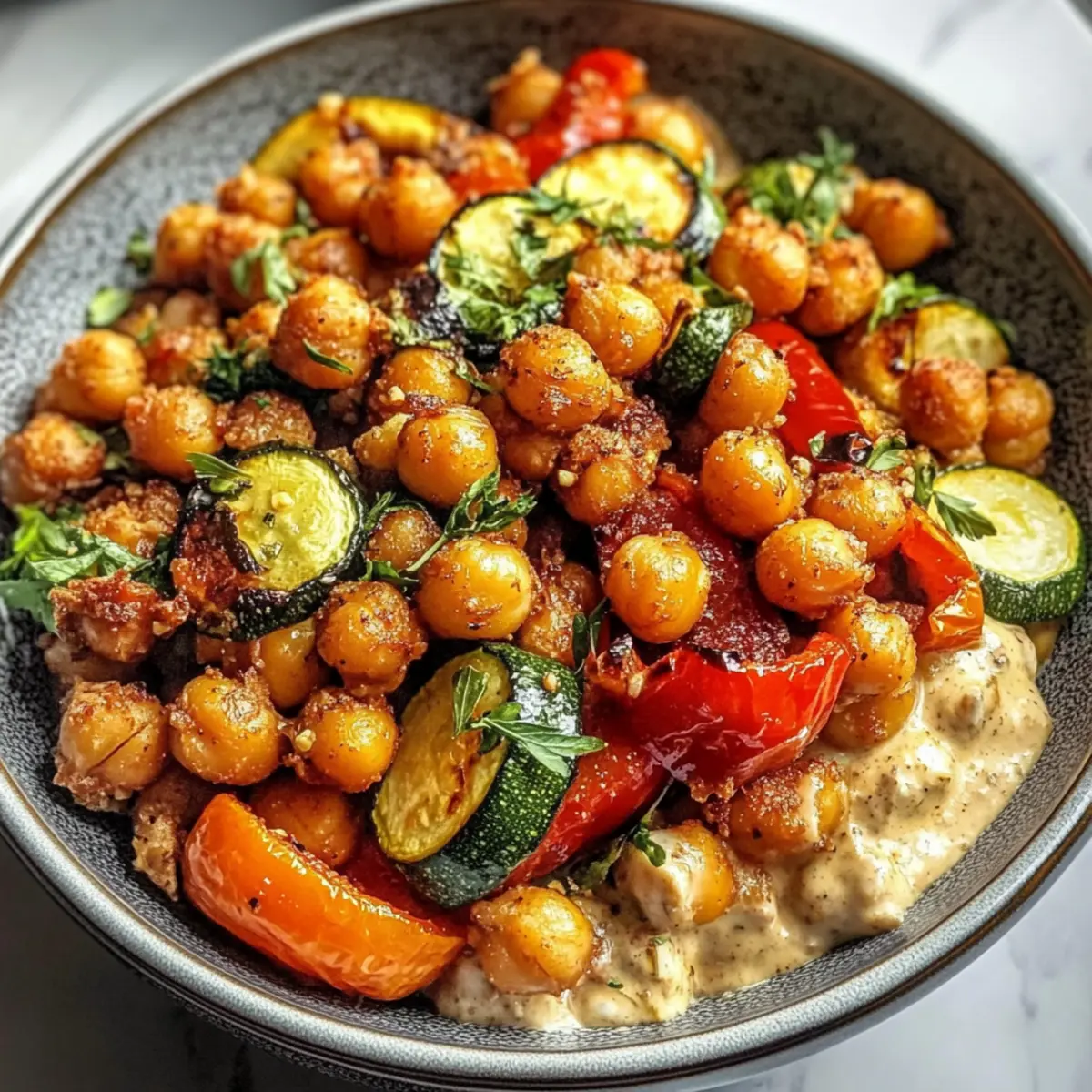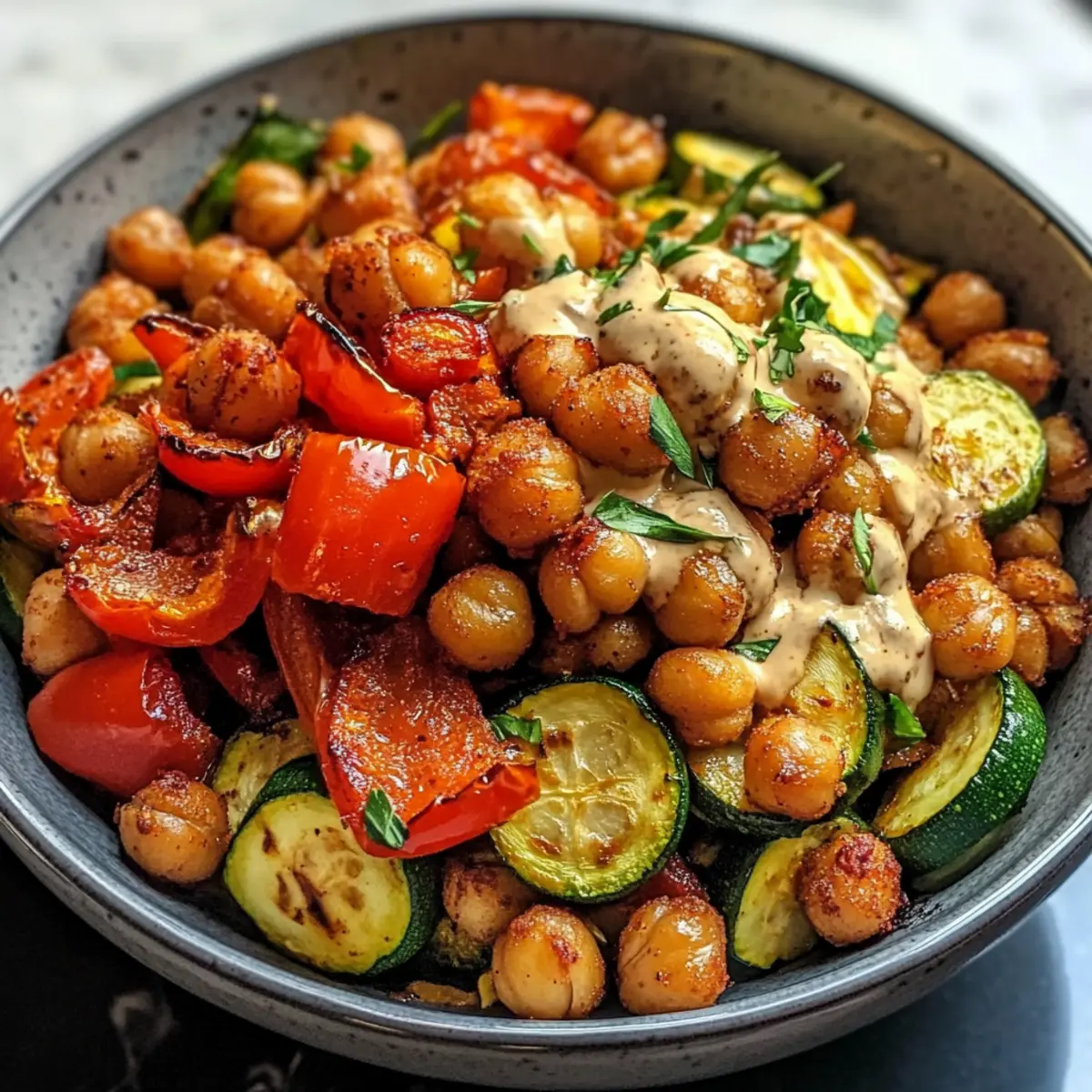 Wenn ich an gemütliche Abendessen mit frischen, gesunden Zutaten denke, dann schwebt mir sofort eine Schüssel mit gerösteten Kichererbsen und knackigem Gemüse vor. Diese „Ultimate Roasted Chickpea and Veggie Bowl“ ist eine wahre Freude – und das nicht nur wegen ihres köstlichen Geschmacks! Die Kombination aus knackigen Kichererbsen, zartem Zucchini und bunten Paprika ist nicht nur vegan und glutenfrei, sondern eignet sich auch hervorragend für Meal Prep. In nur wenigen Minuten zauberst du ein Gericht, das sowohl an stressigen Wochentagen als auch beim gemütlichen Dinner mit Freunden begeistert. Und das Beste? Du kannst diese Schüssel nach Herzenslust anpassen, je nach dem, was dein Kühlschrank hergibt. Bist du bereit, deine Küche mit mir aufzupeppen?