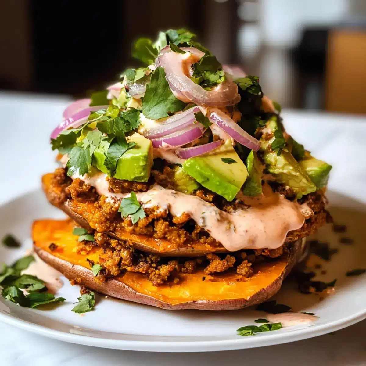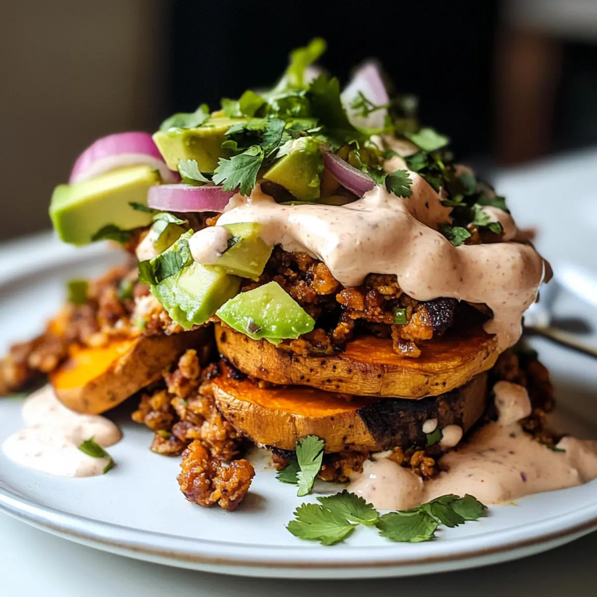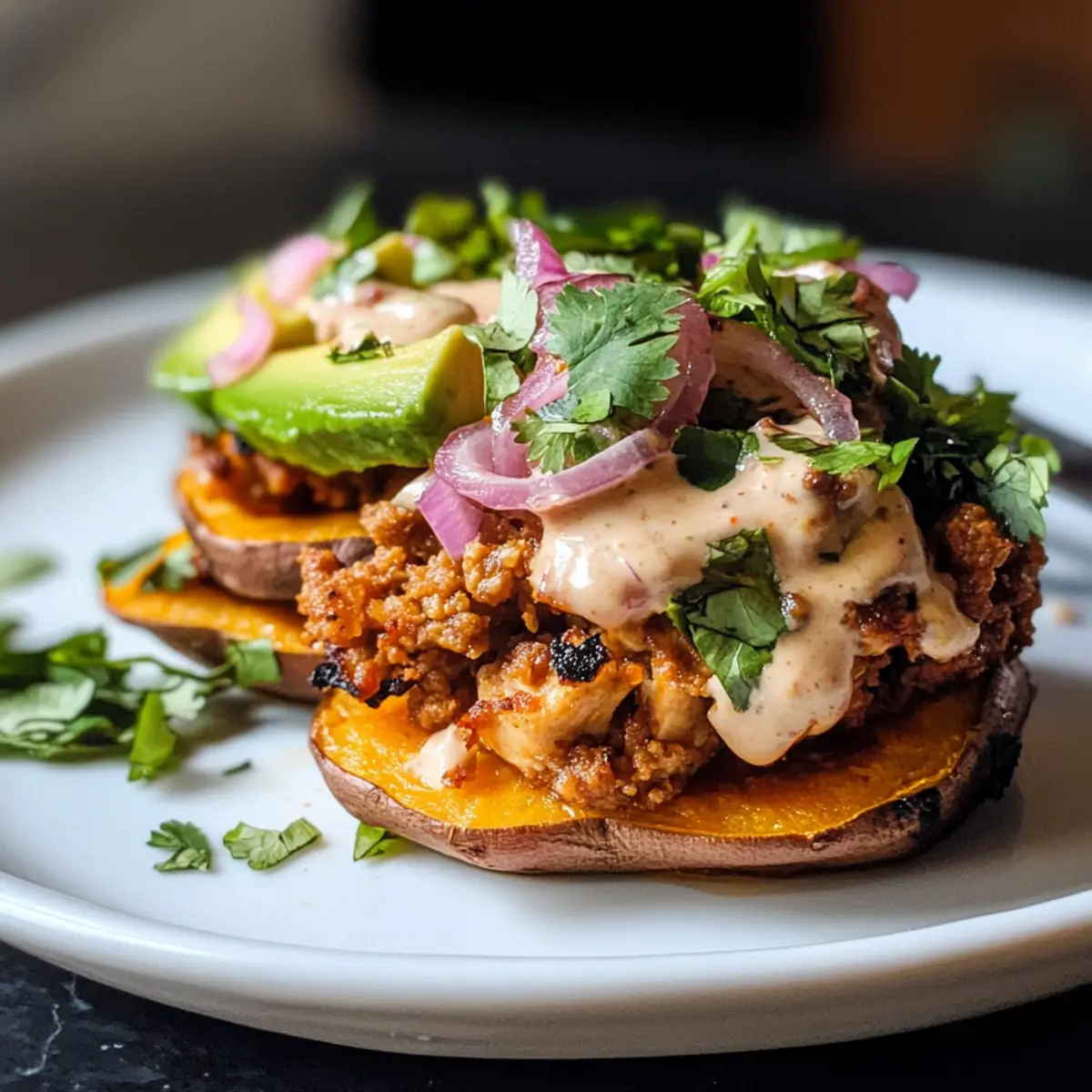 Drizzle die cremige Chipotle-Sauce über die Süßkartoffelstapel und toppe sie mit Avocado, frischem Koriander und eingelegten Zwiebeln. Diese Kombination bringt zusätzliche Frische und Knusprigkeit in dein Gericht.