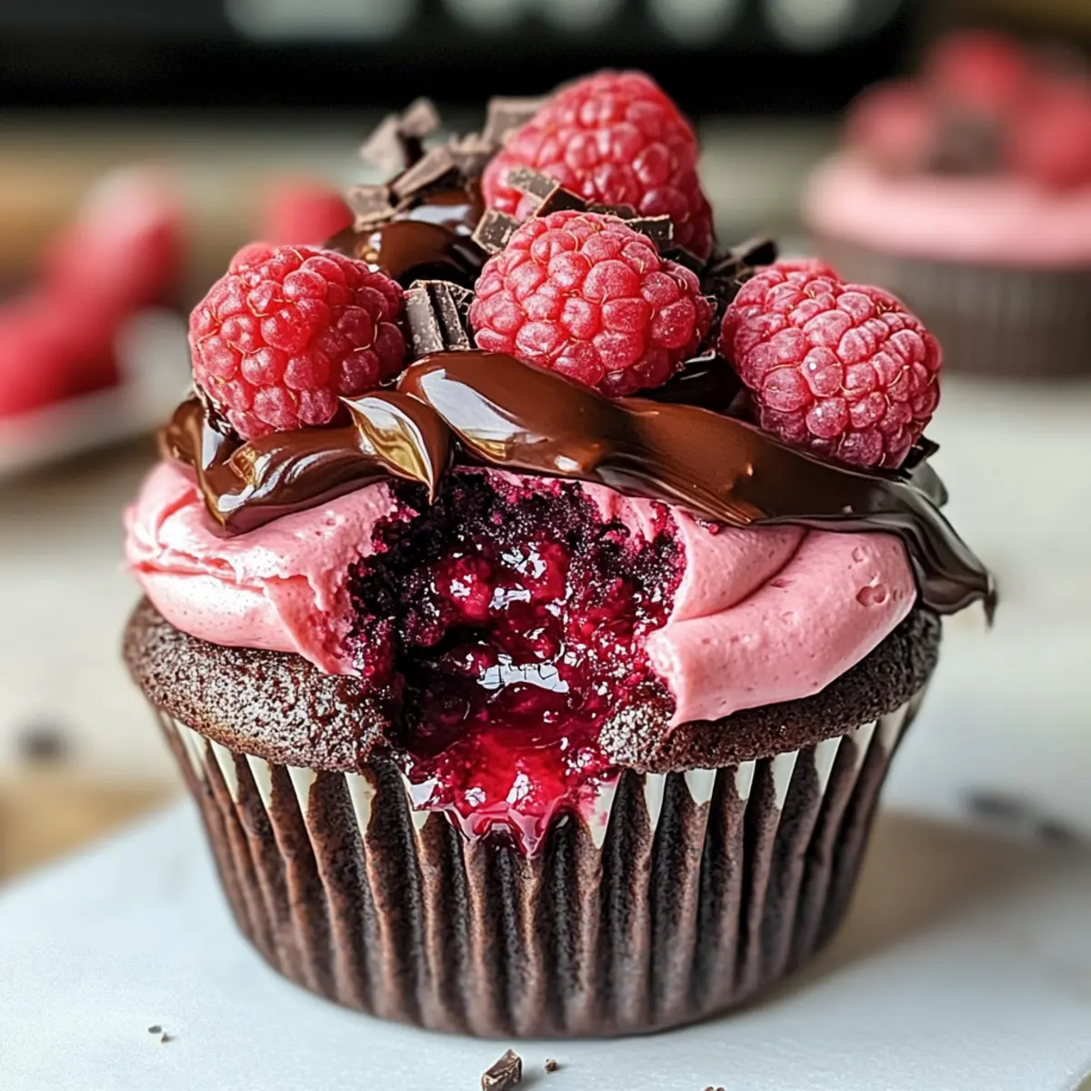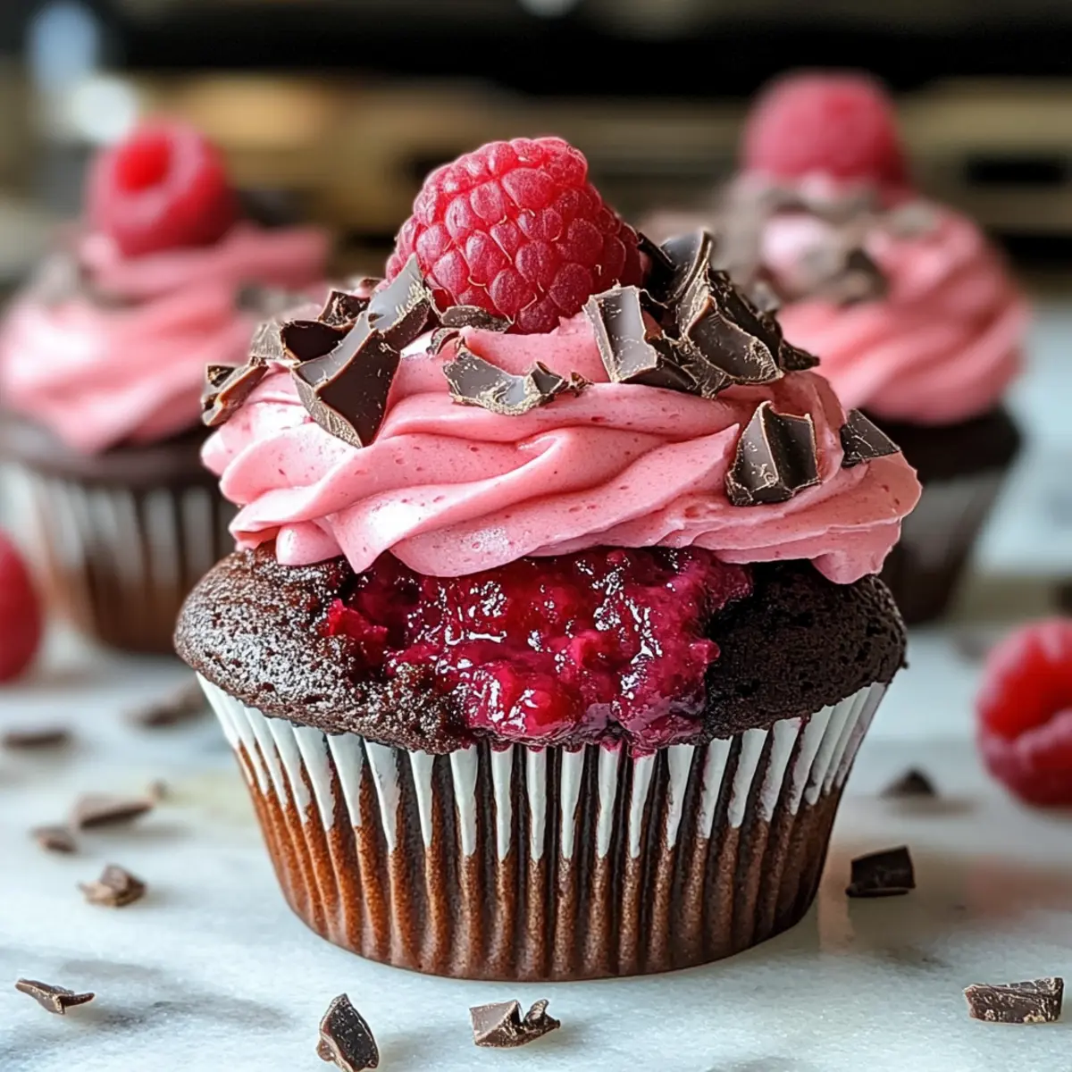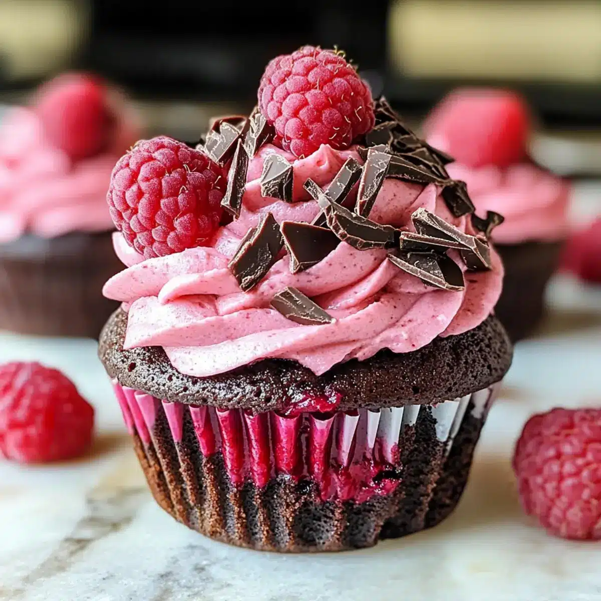 Frost die abgekühlten Cupcakes mit der Himbeerbuttercreme und garniere sie mit frischen Himbeeren und Schokoladenraspeln. Die Garnitur verleiht den Cupcakes nicht nur einen ansprechenden Look, sondern setzt auch einen schönen Kontrast zu den süßen und schokoladigen Aromen.