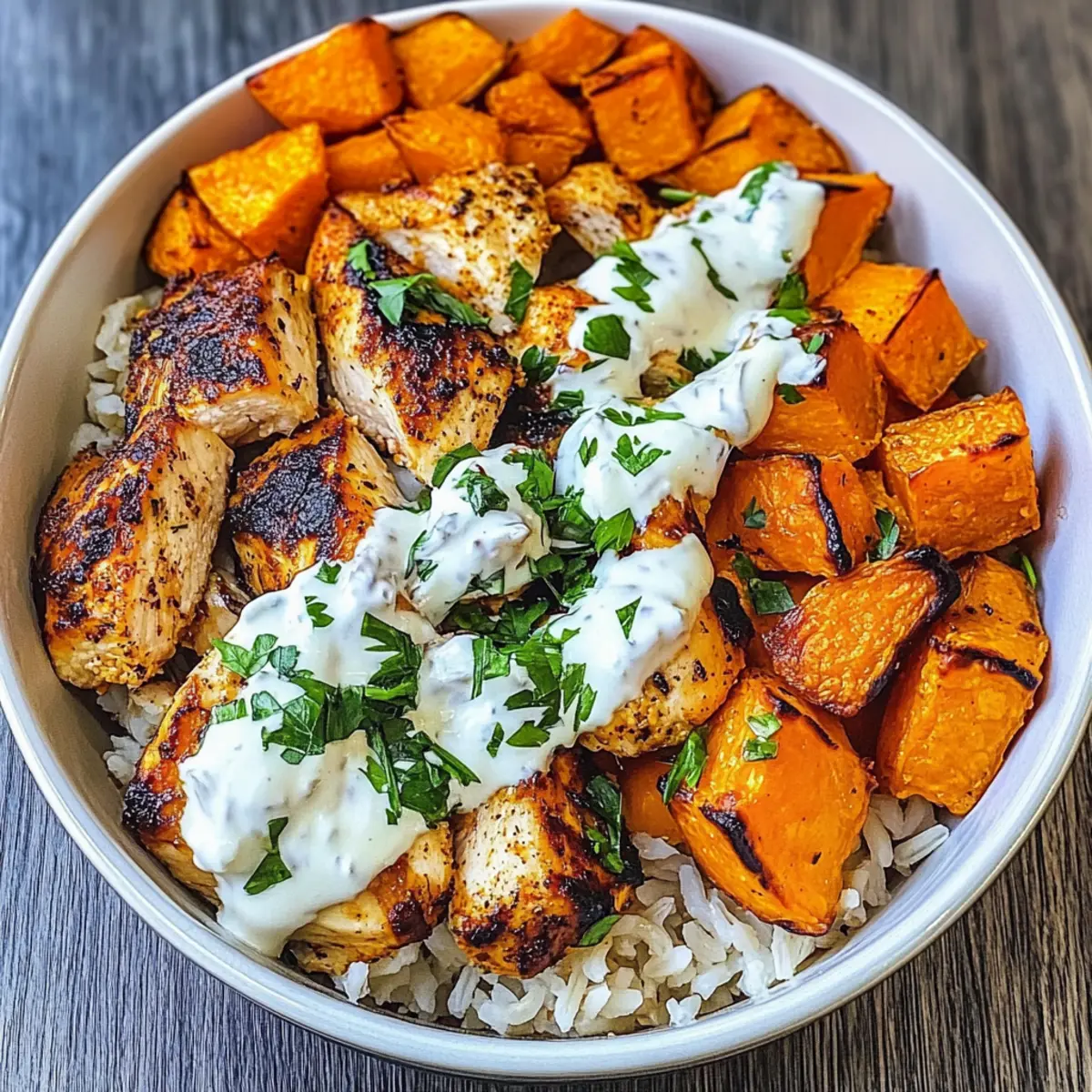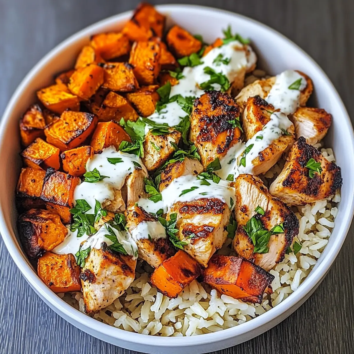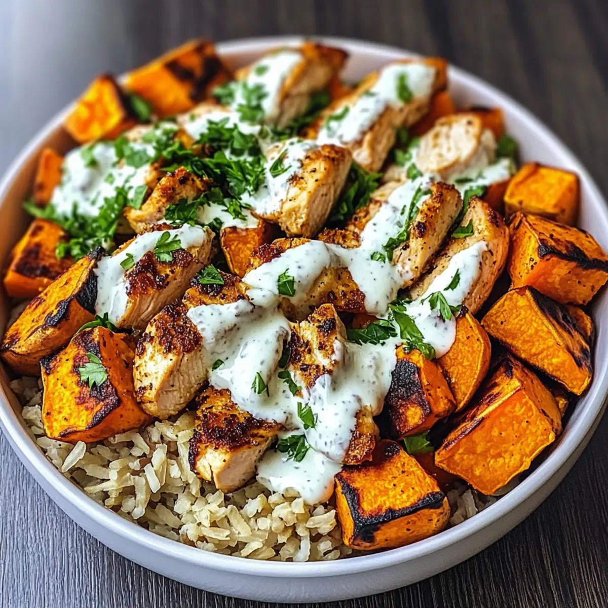 Nun ist es an der Zeit, die Hühnchen Süßkartoffelschüssel zusammenzustellen! Beginnen Sie mit einer Schicht braunem Reis als Basis, fügen Sie die knusprigen Süßkartoffeln und das zarte Hühnchen hinzu. Träufeln Sie die Joghurt-Sauce darüber und garnieren Sie das Ganze mit frisch gehackter Petersilie für einen letzten Farbtupfer und frischen Geschmack.