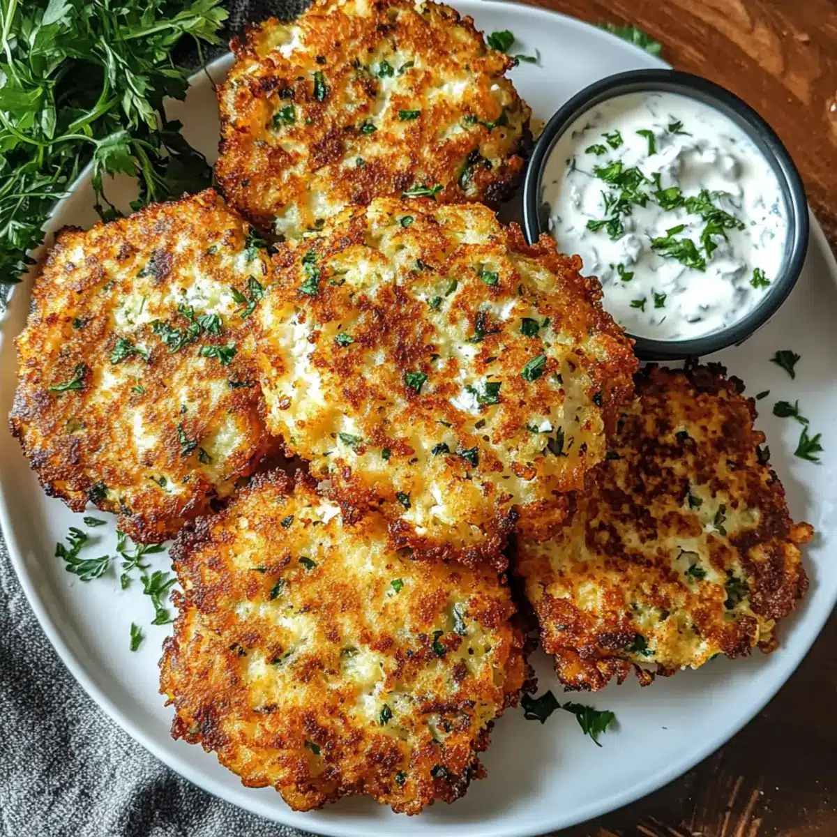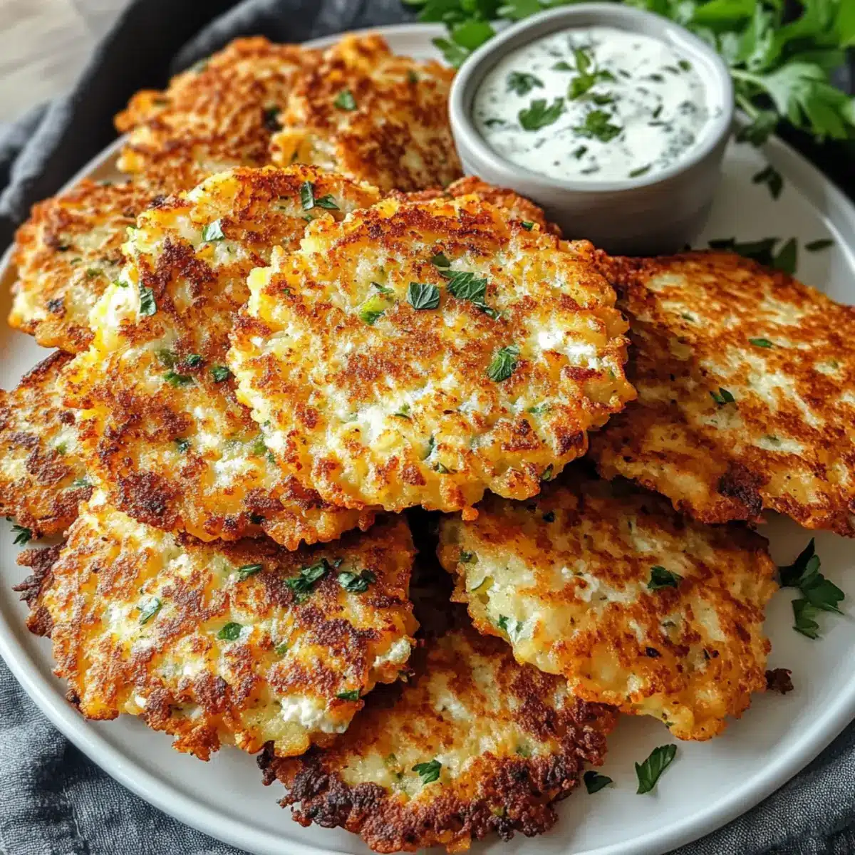 Kräuterquark: Ein cremiger Dip mit frischen Kräutern und Joghurt ergänzt die Hüttenkäsepuffer wunderbar. Er sorgt für einen geschmacklichen Kontrast und sorgt für zusätzliche Frische.
