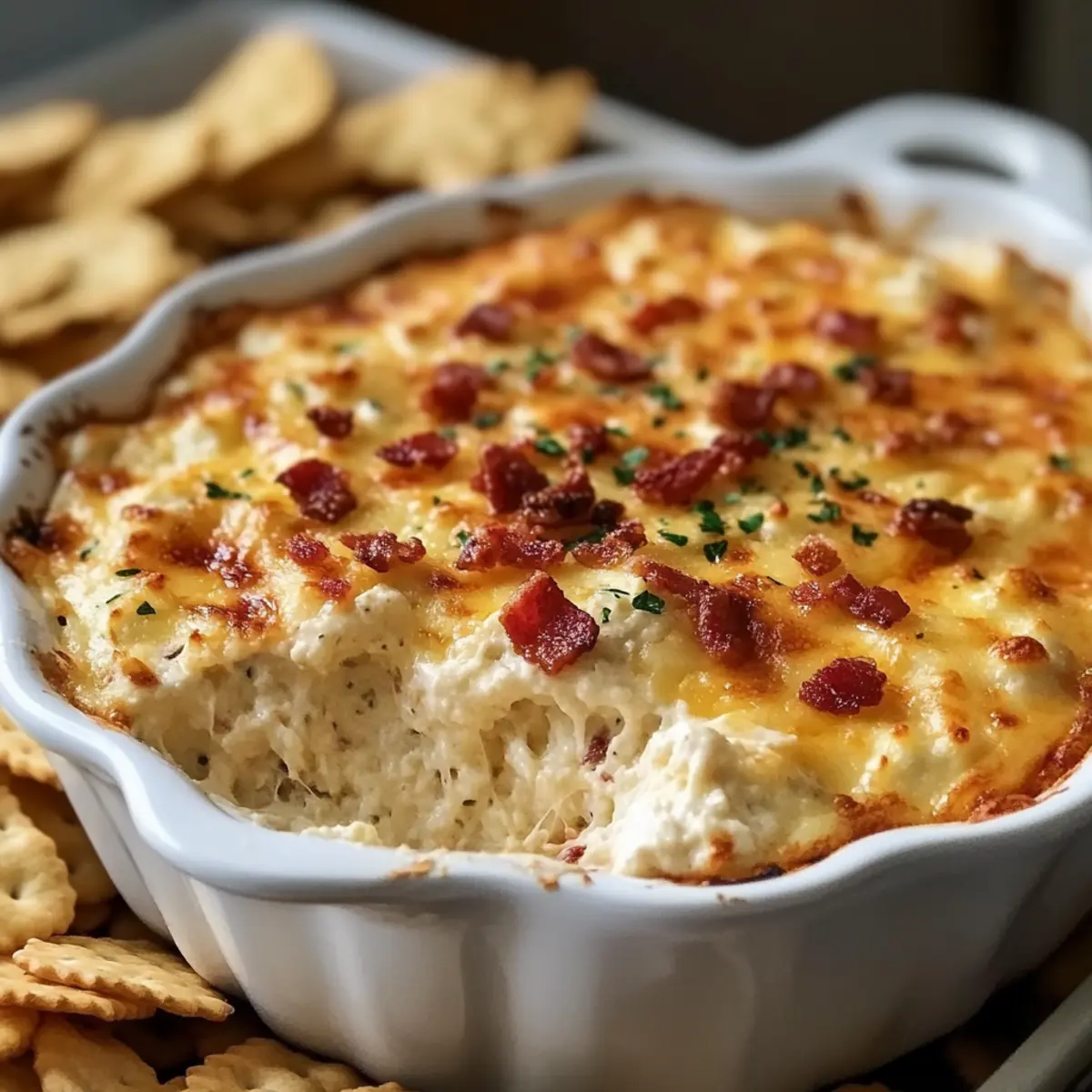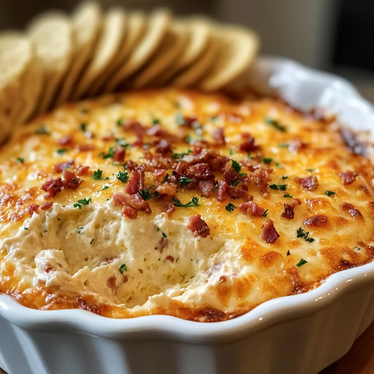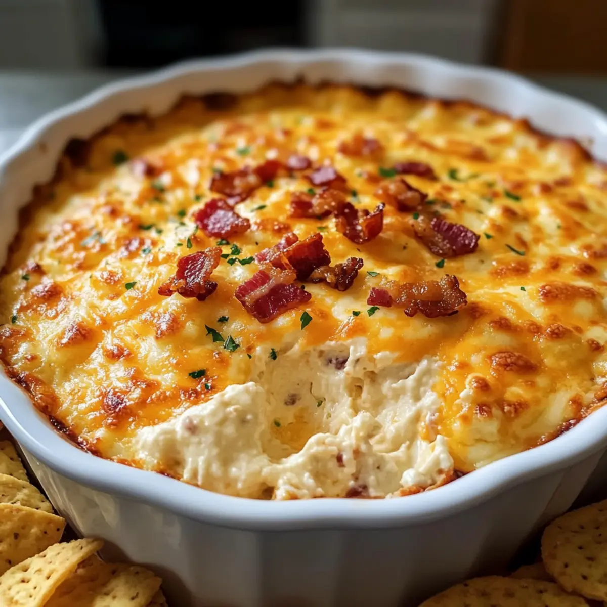 - Garnieren und servieren: Mit restlichem Bacon und Frühlingszwiebeln garnieren und warm mit Crackern oder Chips servieren.