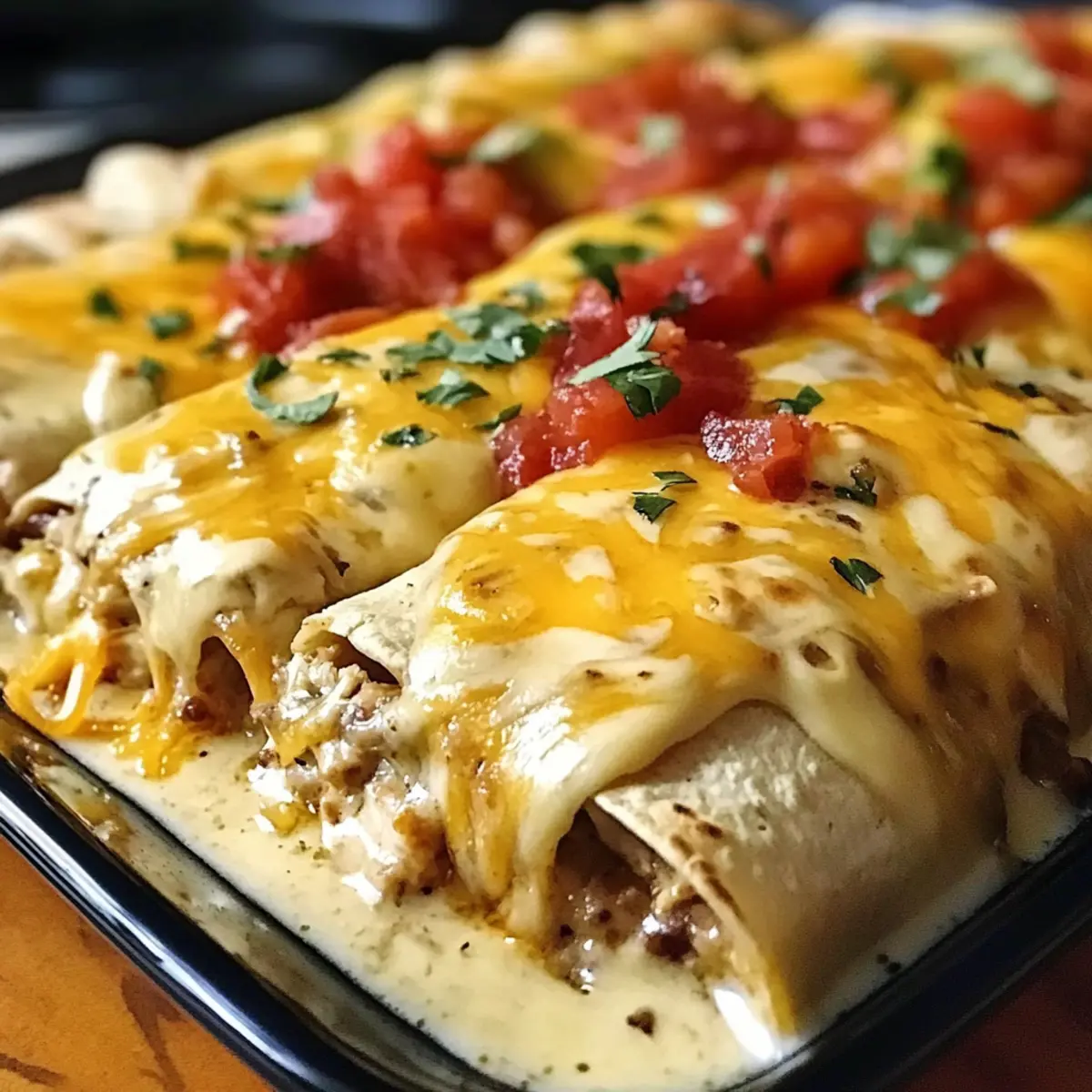 Gieße die bereitgestellte Sauce gleichmäßig über die Enchiladas in der Auflaufform, sodass sie gut bedeckt sind. Streue den restlichen geriebenen Cheddar darüber, um eine köstliche, schmelzende Käseschicht zu erzeugen. Diese Schicht ist wichtig für die perfekte Kruste!