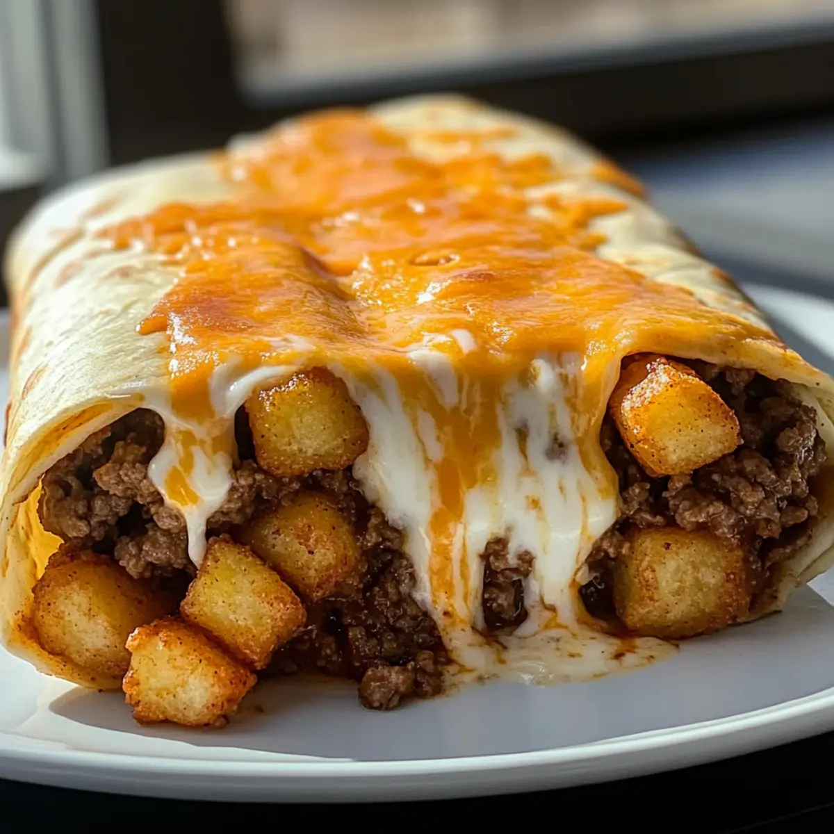 In einer großen Schüssel kombinierst du das gebräunte Hackfleisch mit den knusprigen Tater Tots. Füge die geriebenen Käsesorten (Cheddar und Monterey Jack) hinzu und falte alles gut um, bis die Füllung gleichmäßig vermischt ist. Die Mischung sollte herzhaft und cremig sein – ein wahres Highlight für deine Käse Kartoffel Burritos!