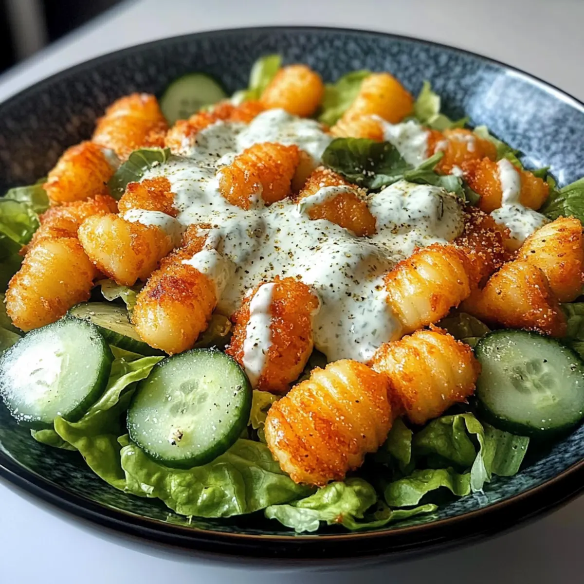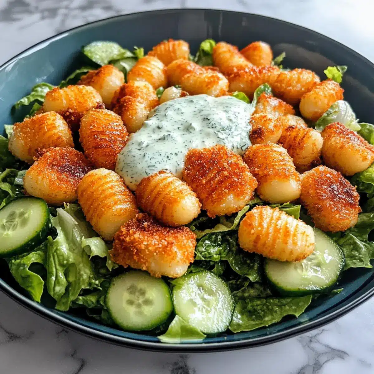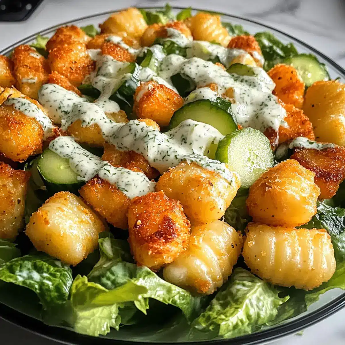 - Frisch anrichten: Serviere den Salat sofort, solange die Gnocchi warm und knusprig sind, damit die Textur erhalten bleibt.