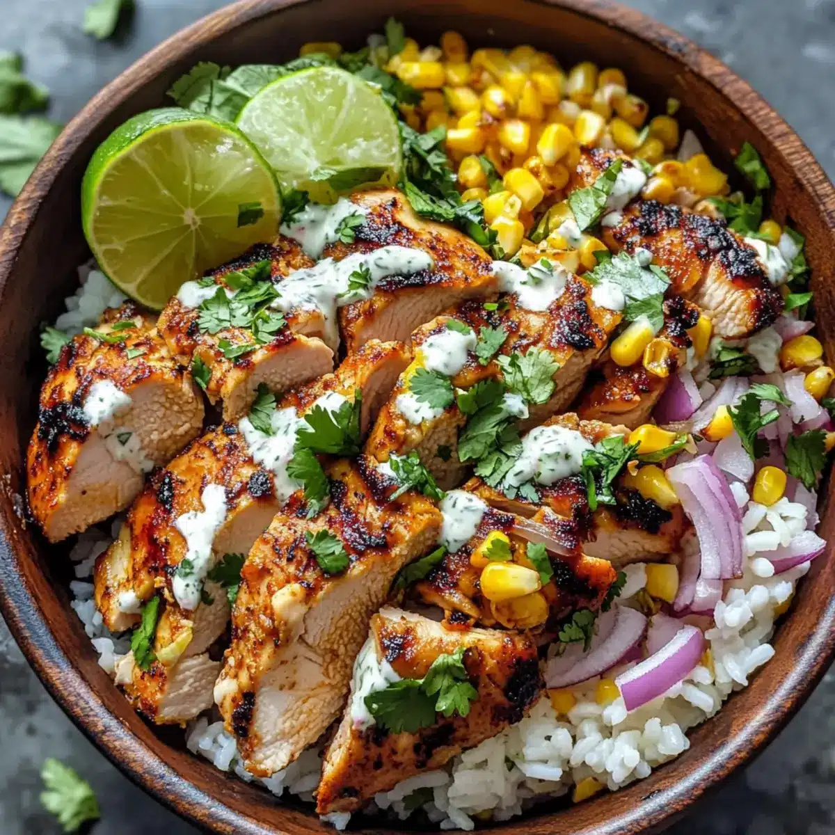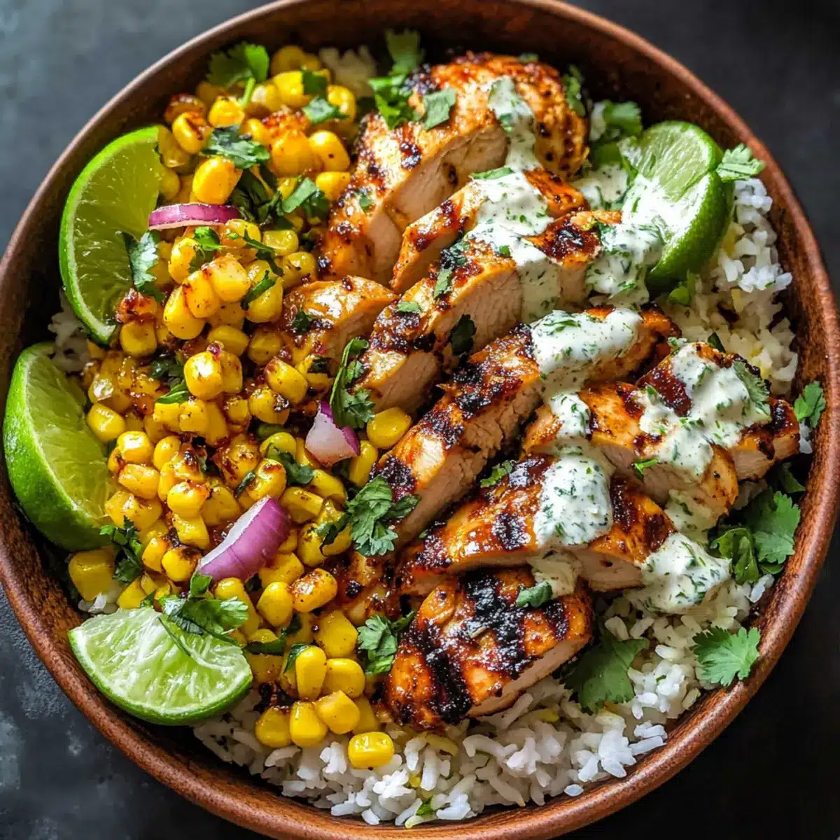 Teile den warmen Reis gleichmäßig auf Schüsseln auf. Belege ihn mit den geschnittenen Hähnchenstücken und einer großzügigen Portion der cremigen Maismischung. Garniere jede Schüssel mit frischen Korianderblättern, zusätzlichem Cotija und einem Limettenviertel für extra Frische, was die leckere Straßenmais-Hühnchen-Schüssel komplettiert.