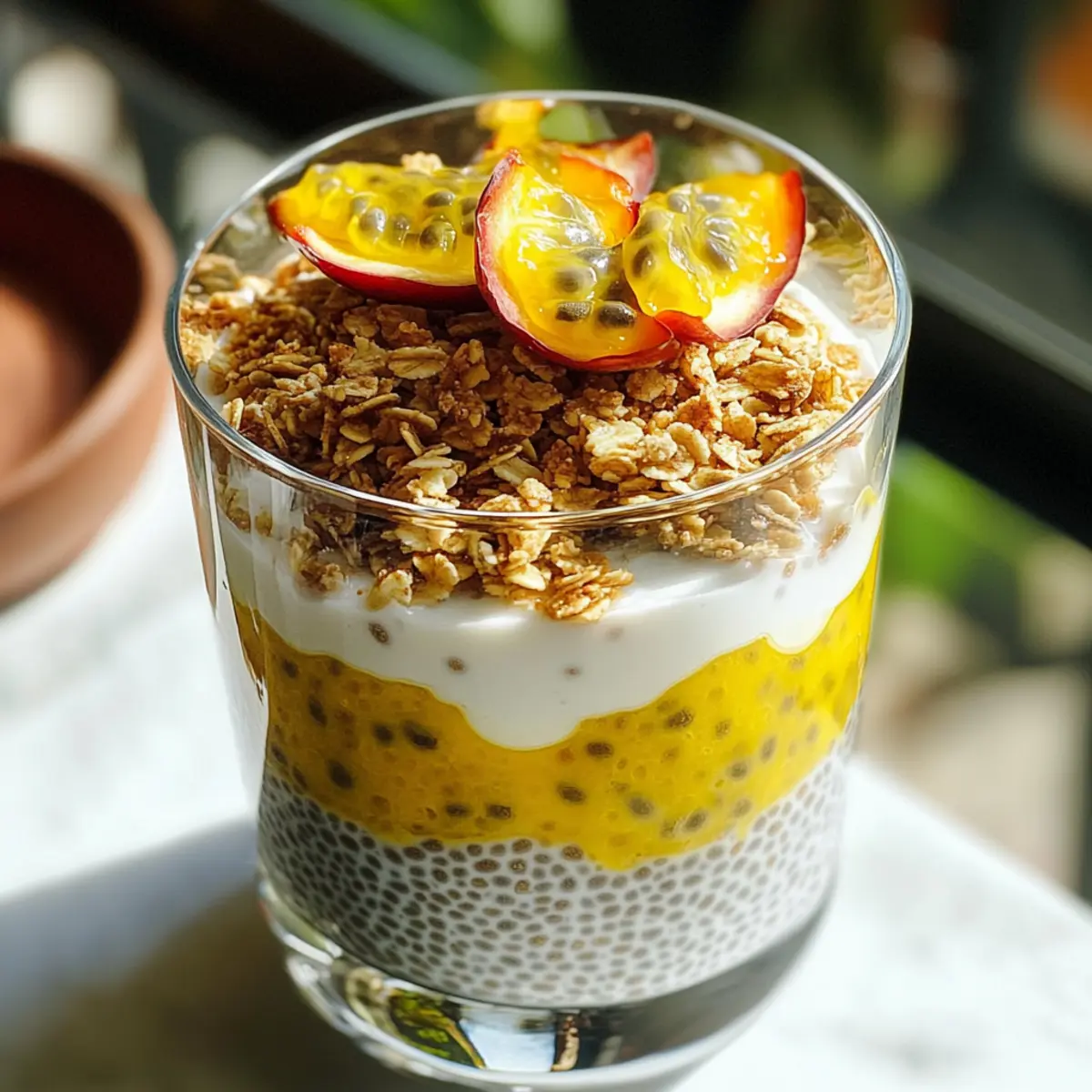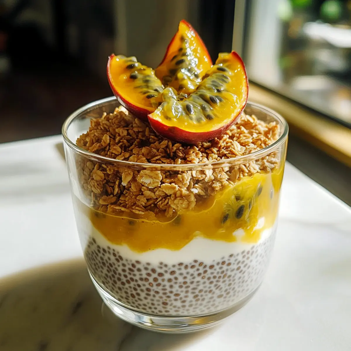 Jetzt kommt das Beste! Verteile das Fruchtfleisch der Maracuja über die Schichten. Wenn du mehr Fruchtgeschmack möchtest, füge zusätzliche Maracuja- oder Mangostücke für eine tropische Note hinzu. Toppe den Pudding nach Belieben mit Granola für ein knuspriges Finish.