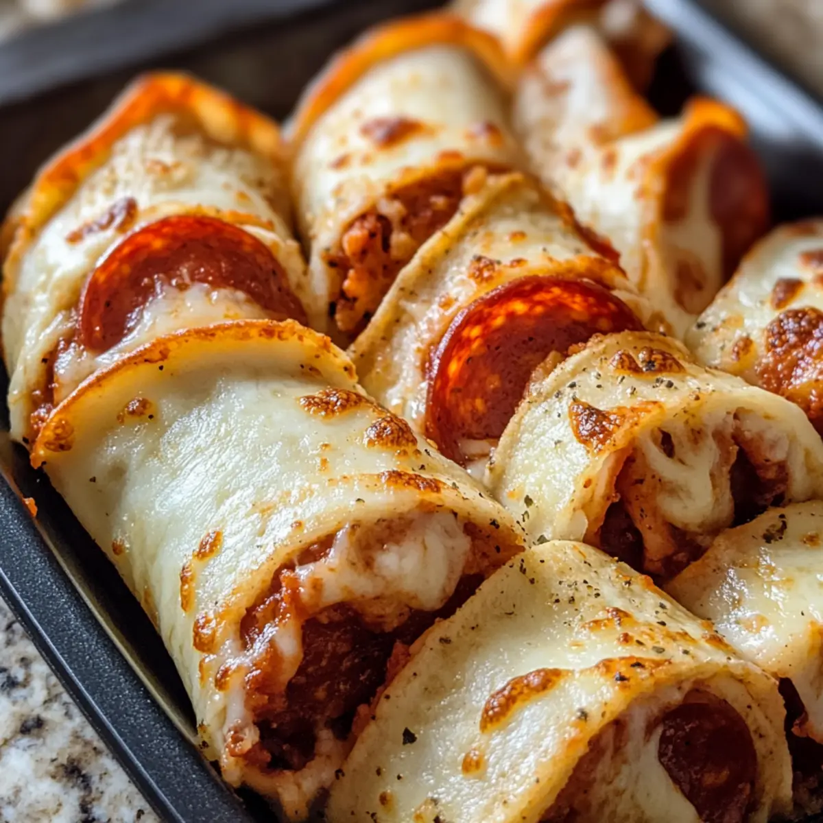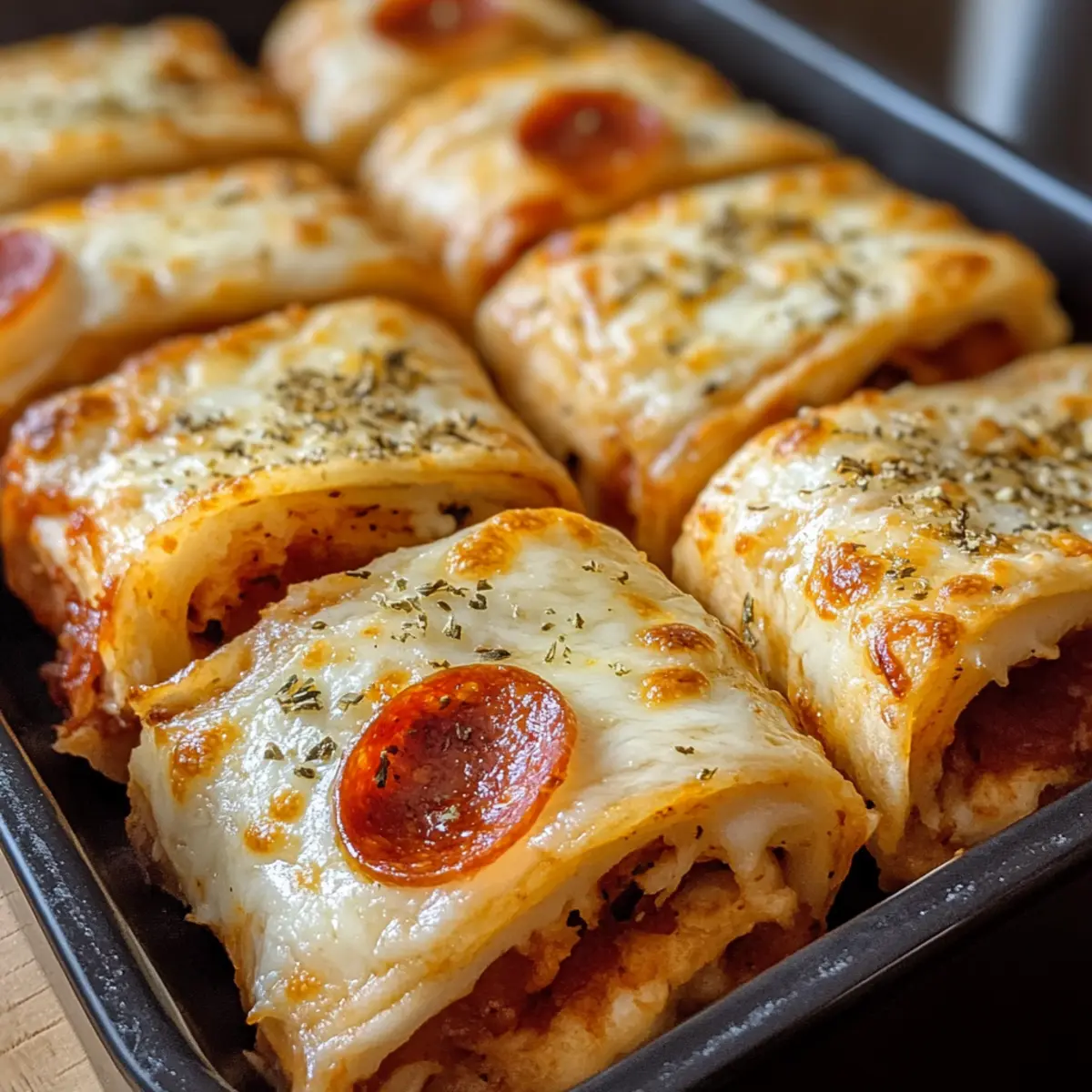 - Pizza-Rollen im vorgeheizten Ofen für etwa 10 Minuten backen, bis der Käse geschmolzen und die Tortillas goldbraun sind.