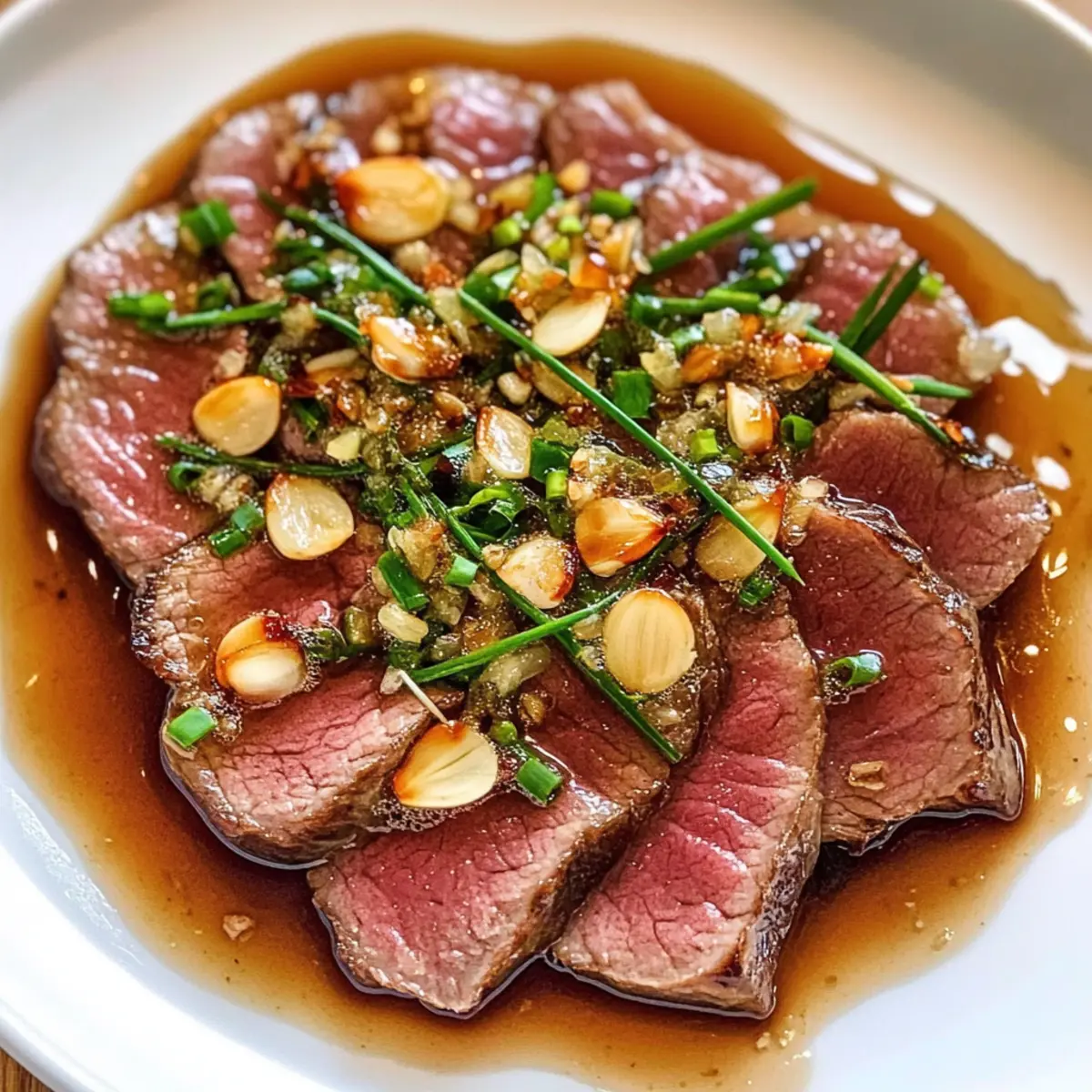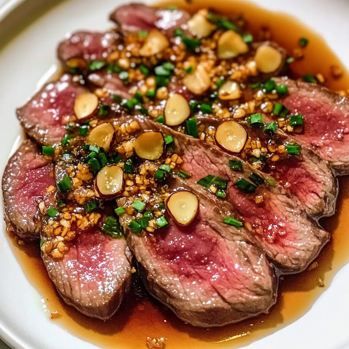 Exquisiter Geschmack: Die Kombination aus zarter Rinderfilet, spritziger Ponzu-Sauce und knusprigen Knoblauchchips macht jeden Bissen unvergesslich.