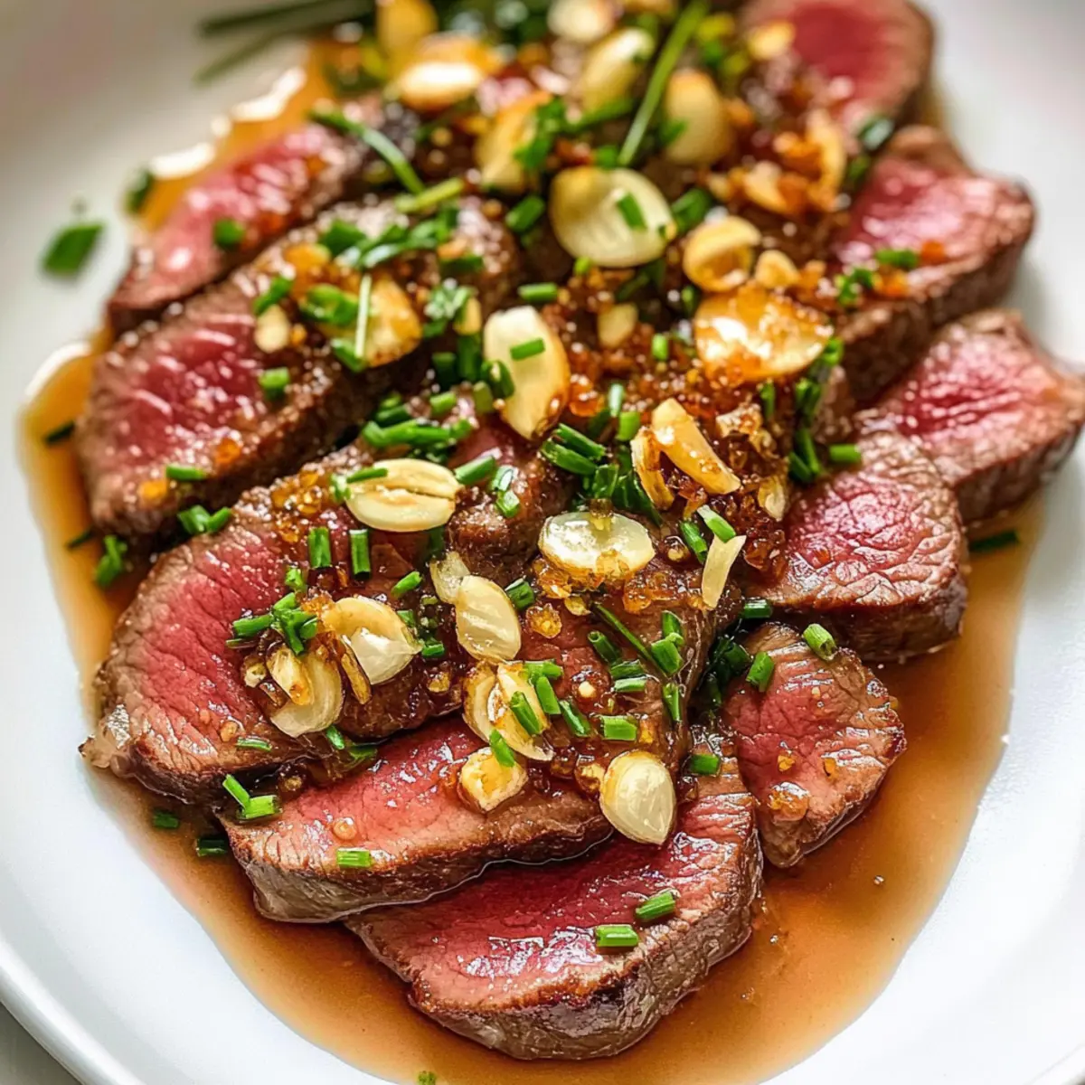Nehmen Sie das Steak aus dem Kühlschrank und schneiden Sie es mit einem scharfen Messer in dünne Scheiben. Arrangieren Sie die Rindertataki-Scheiben auf einer Servierplatte, träufeln Sie die vorbereitete Ponzu-Sauce darüber und garnieren Sie das Gericht mit den knusprigen Knoblauchchips und dünn geschnittenem Schnittlauch für zusätzlichen Geschmack und Farbe.