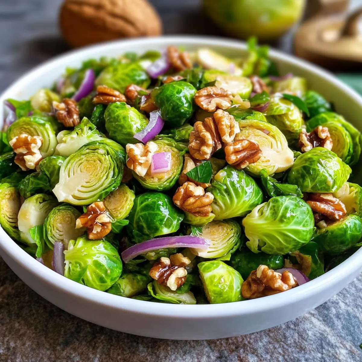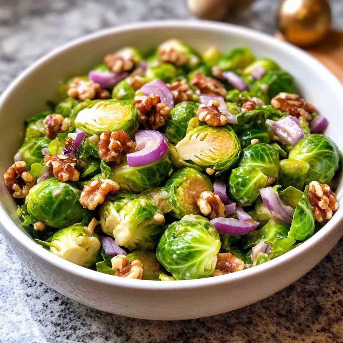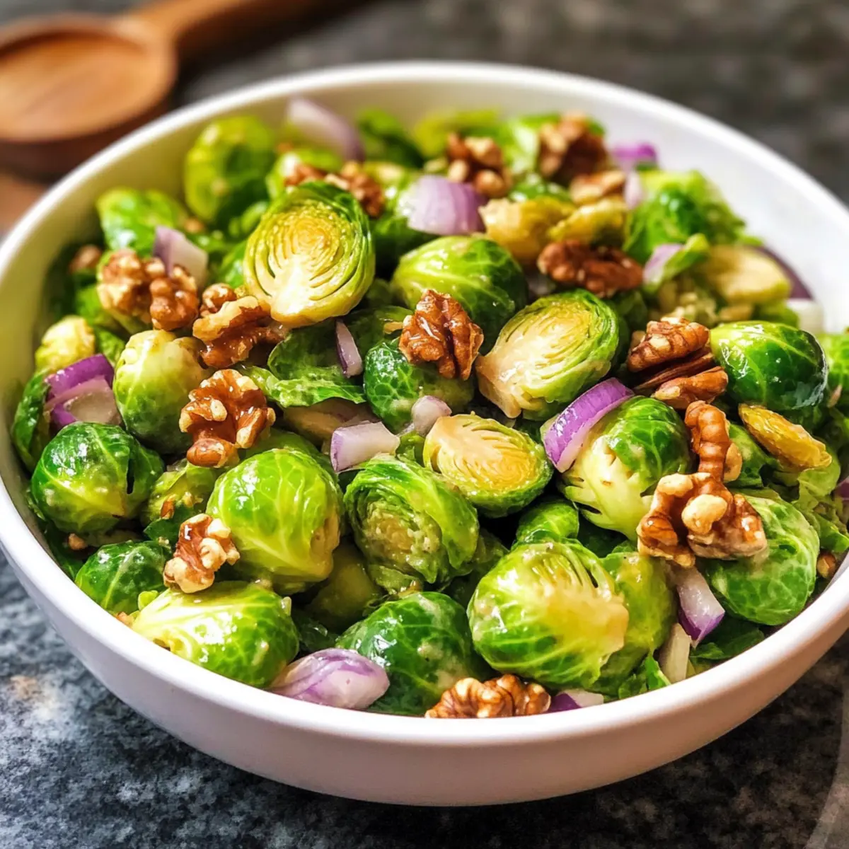 - Zutaten kombinieren: Rosenkohl, Walnüsse und Zwiebel in einer Schüssel mit Dressing vermischen.