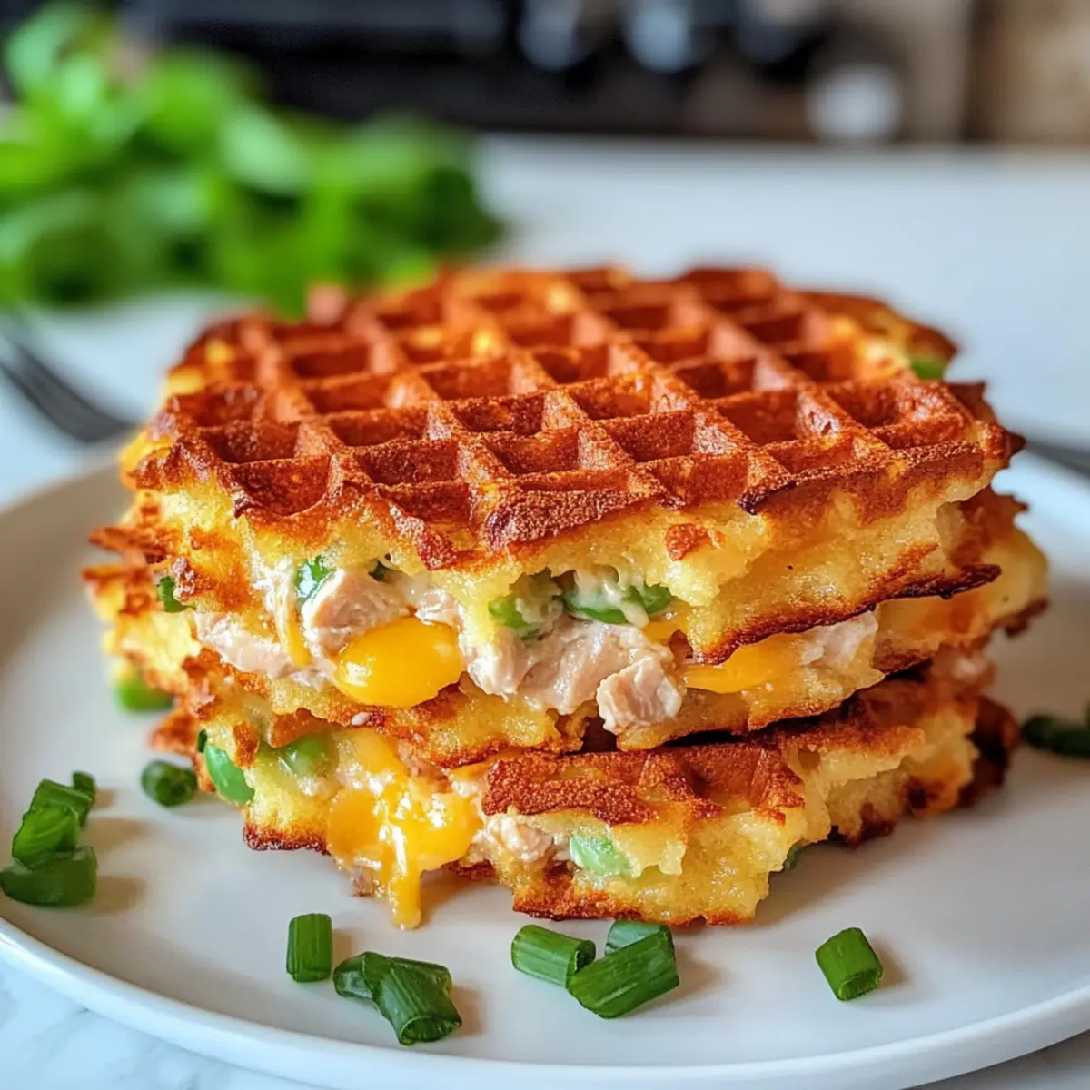 - Mischung ins Waffeleisen geben: Löffle die Hälfte der Thunfischmischung vorsichtig in das Waffeleisen und gare die Chaffle für etwa 4 Minuten.