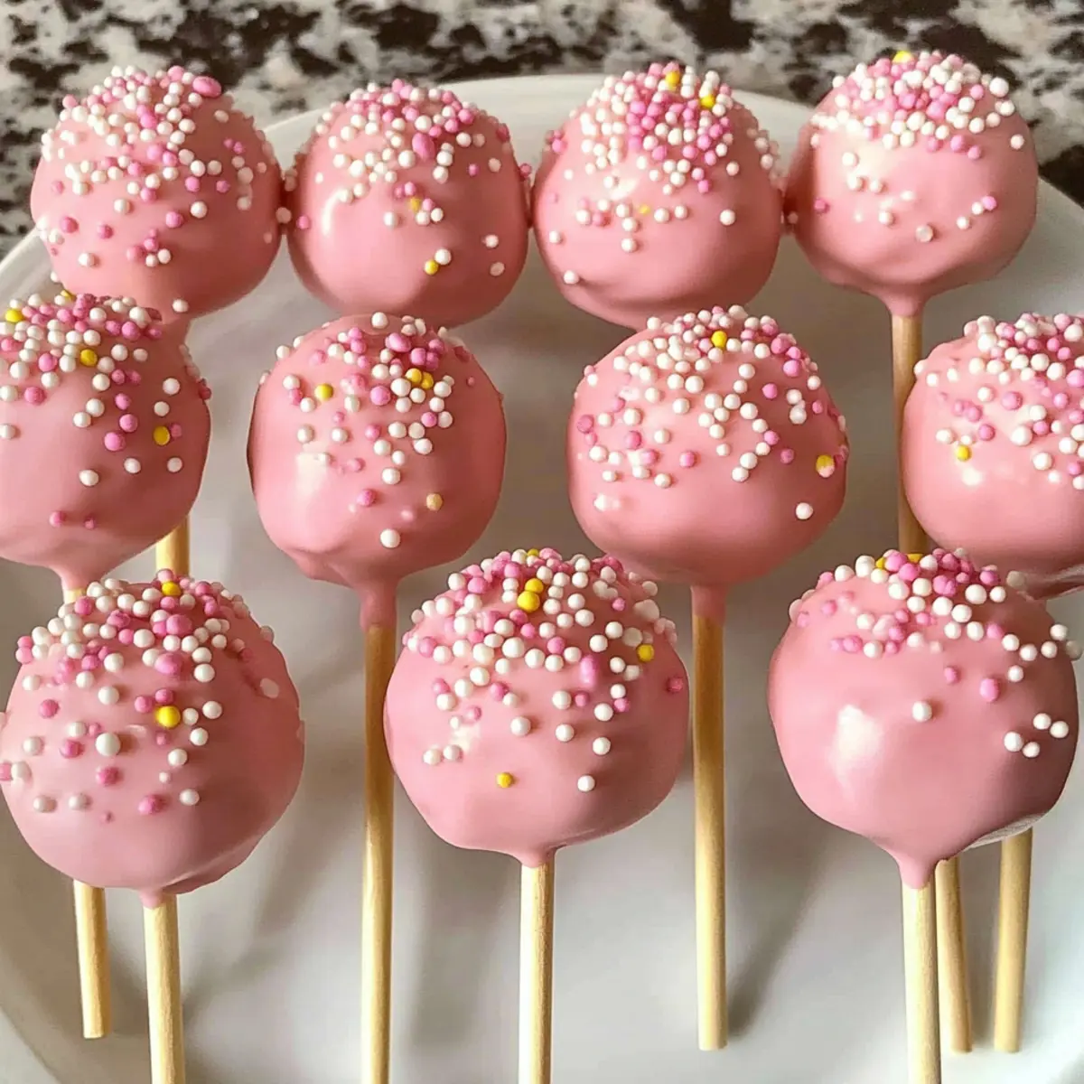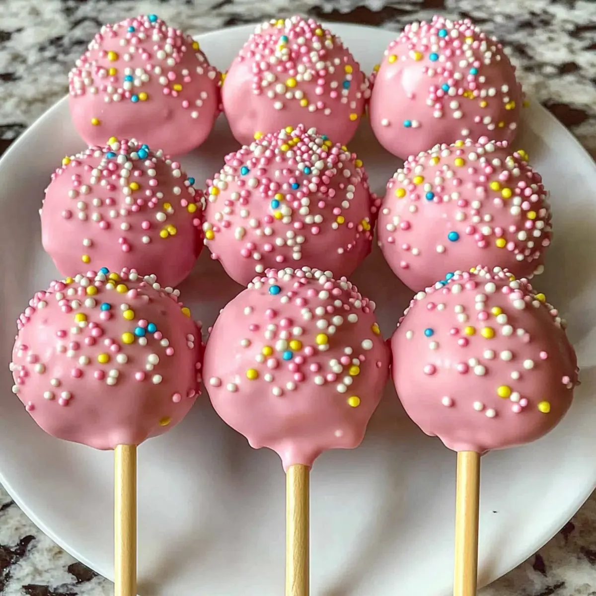 Während die Schokolade noch weich ist, streue die Nonpareils oder bunten Streusel gleichmäßig über die beschichteten Kuchenpops. Platziere sie dann in einem Styroporblock oder auf einem Teller, damit sie vollständig fest werden. So kannst du sicherstellen, dass sie ihre Form behalten und die Dekoration perfekt bleibt.