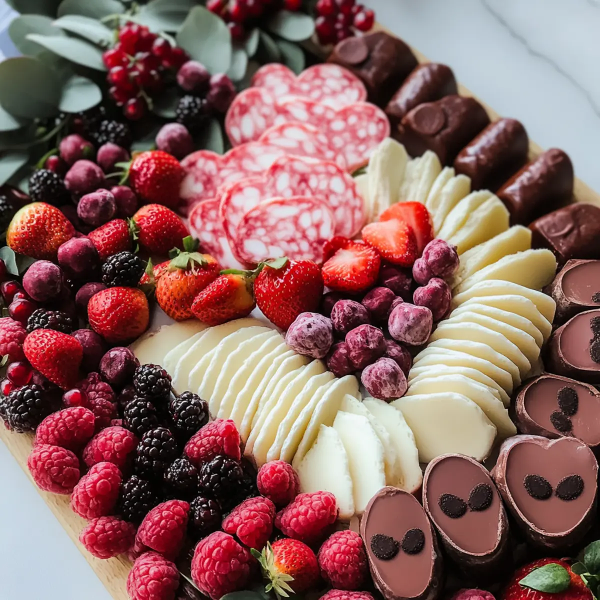 - Rollen oder fächern Sie den Prosciutto und die herzförmigen Salami-Scheiben um die Käsesorten.