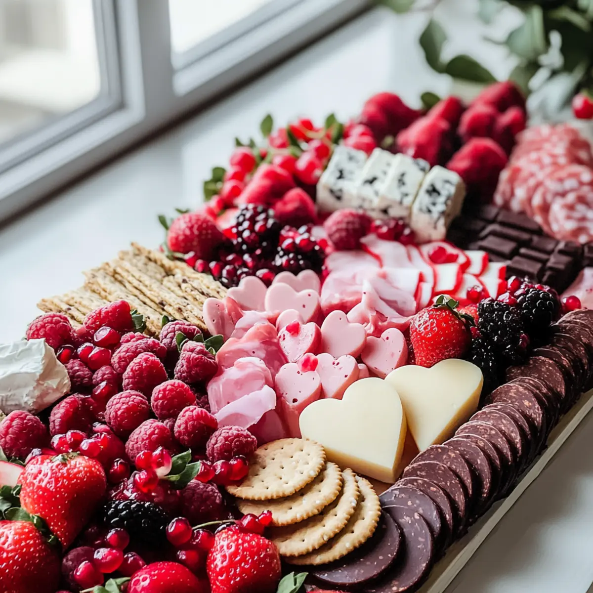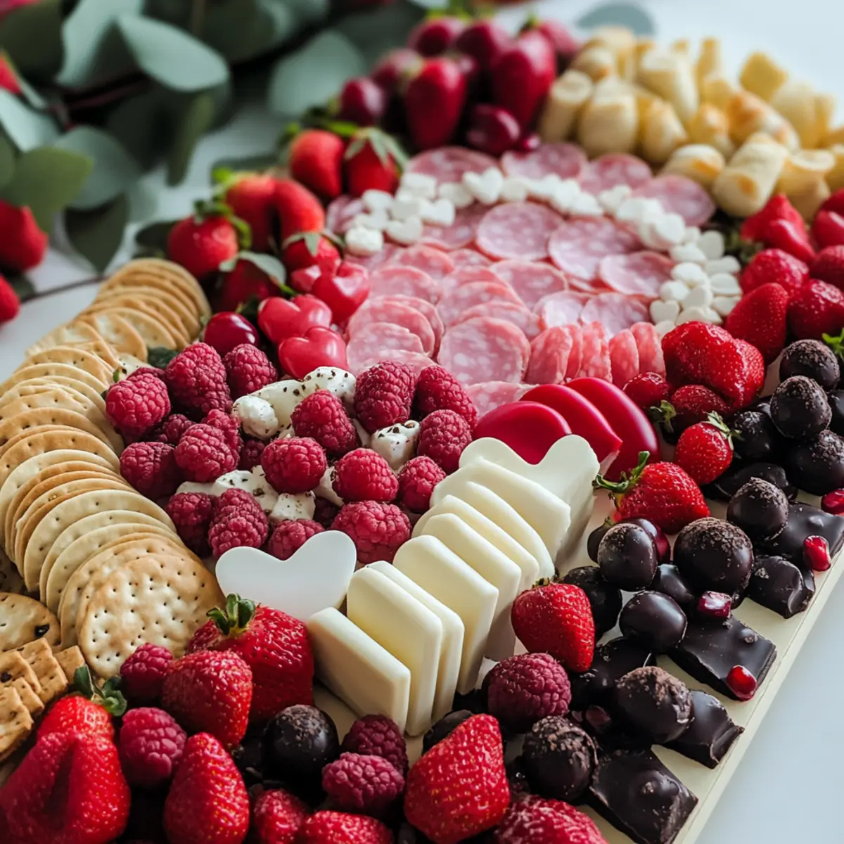 Streuen Sie dunkle Schokoladenpralinen und herzförmige Cracker gleichmäßig über die gesamte Tafel. Diese Klassiker sorgen für zusätzliche Knusprigkeit und süße Leckereien. Variieren Sie die Anordnung, um eine einladende und abwechslungsreiche Präsentation zu schaffen, die zum Naschen einlädt.