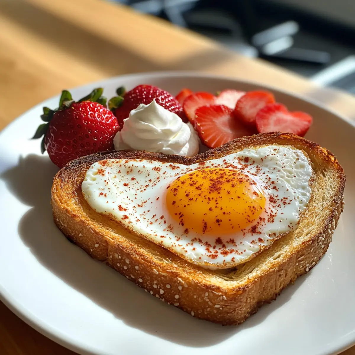 Schneide ein paar frische Erdbeeren und lege sie neben die herzförmigen Toasts auf dem Teller. Zum krönenden Abschluss gib einen Klecks Sahne auf jedes Ei, um deinem süßen Valentinstagsfrühstück mit Herztoast das gewisse Etwas zu verleihen – ganz nach Belieben kann auch eine Herzform mit der Sahne gestaltet werden.