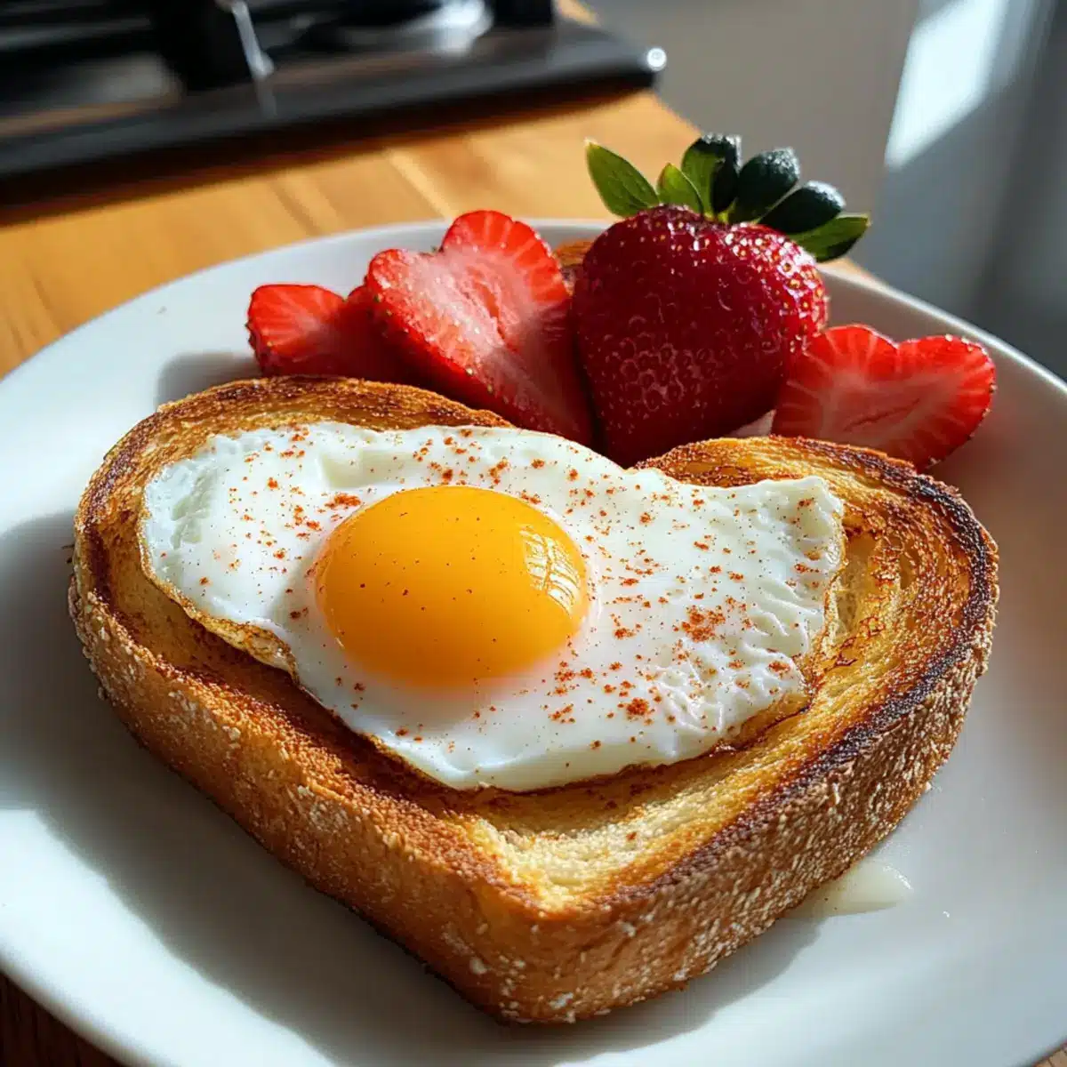 - Richte die Herztoasts auf einem Teller an und platziere jeweils ein Ei darauf.