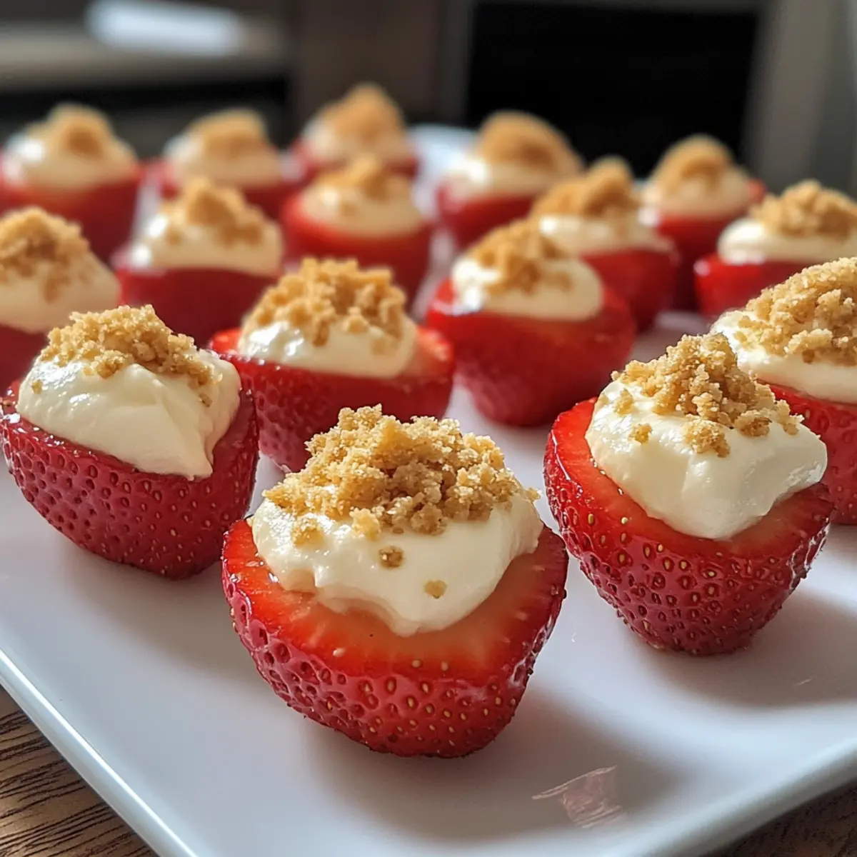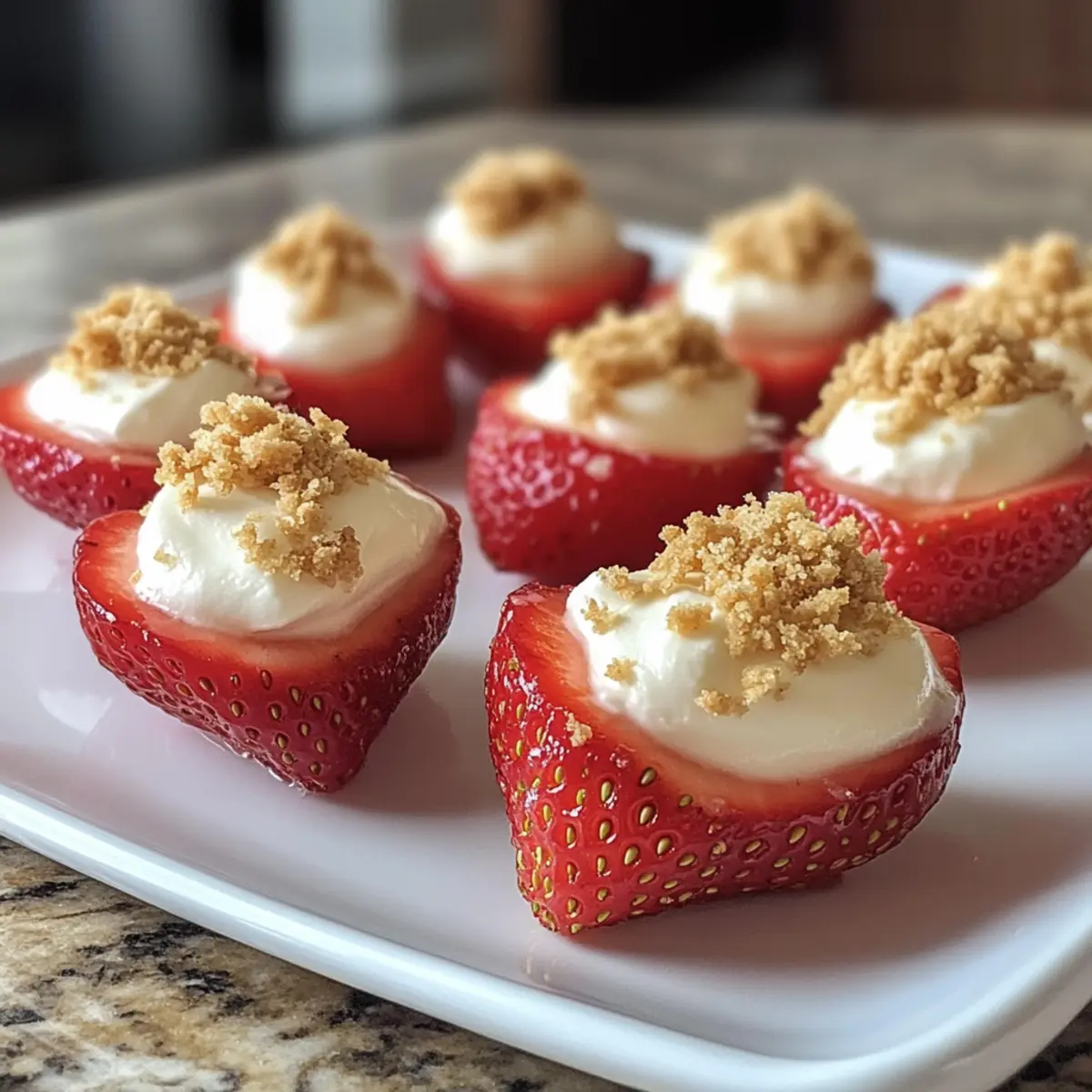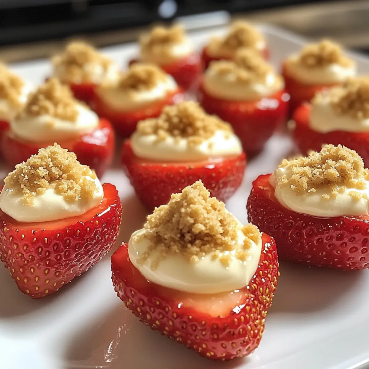 - Bestreue die gefüllten Erdbeeren mit Graham-Cracker-Bröseln und serviere sie.