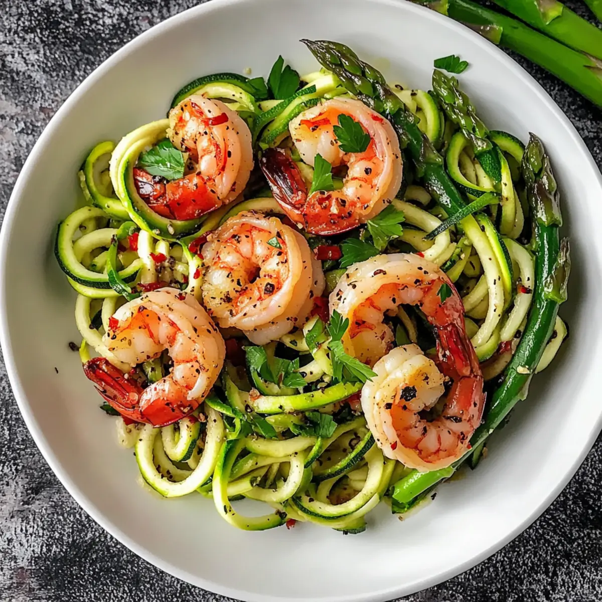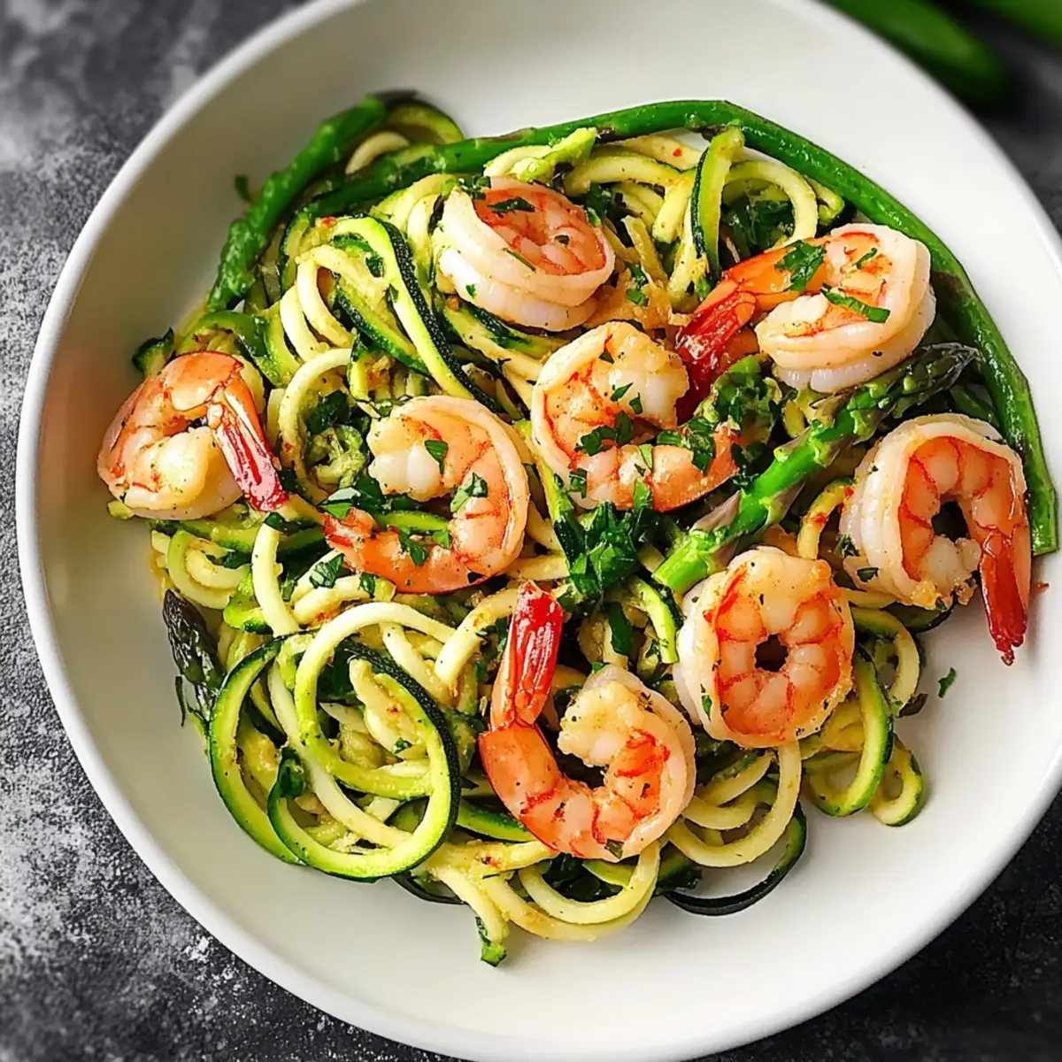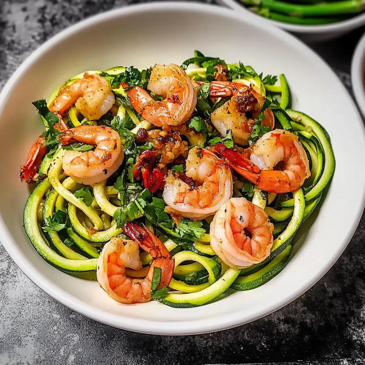 Köstliche Texturen: Der Kontrast zwischen knackigen Zucchini-Nudeln und zarten Garnelen sorgt für ein rundum befriedigendes Geschmackserlebnis.