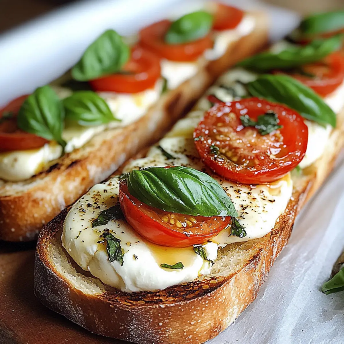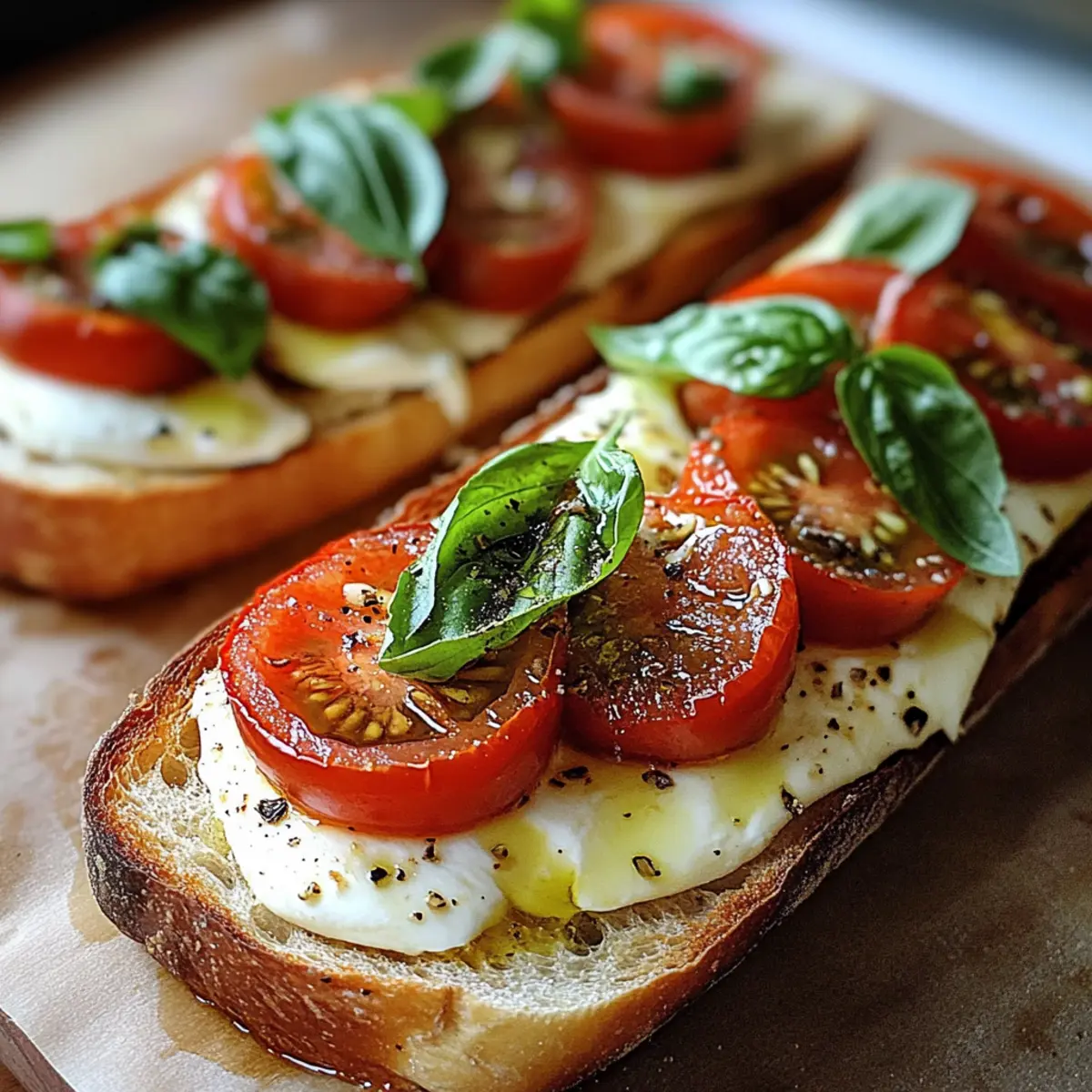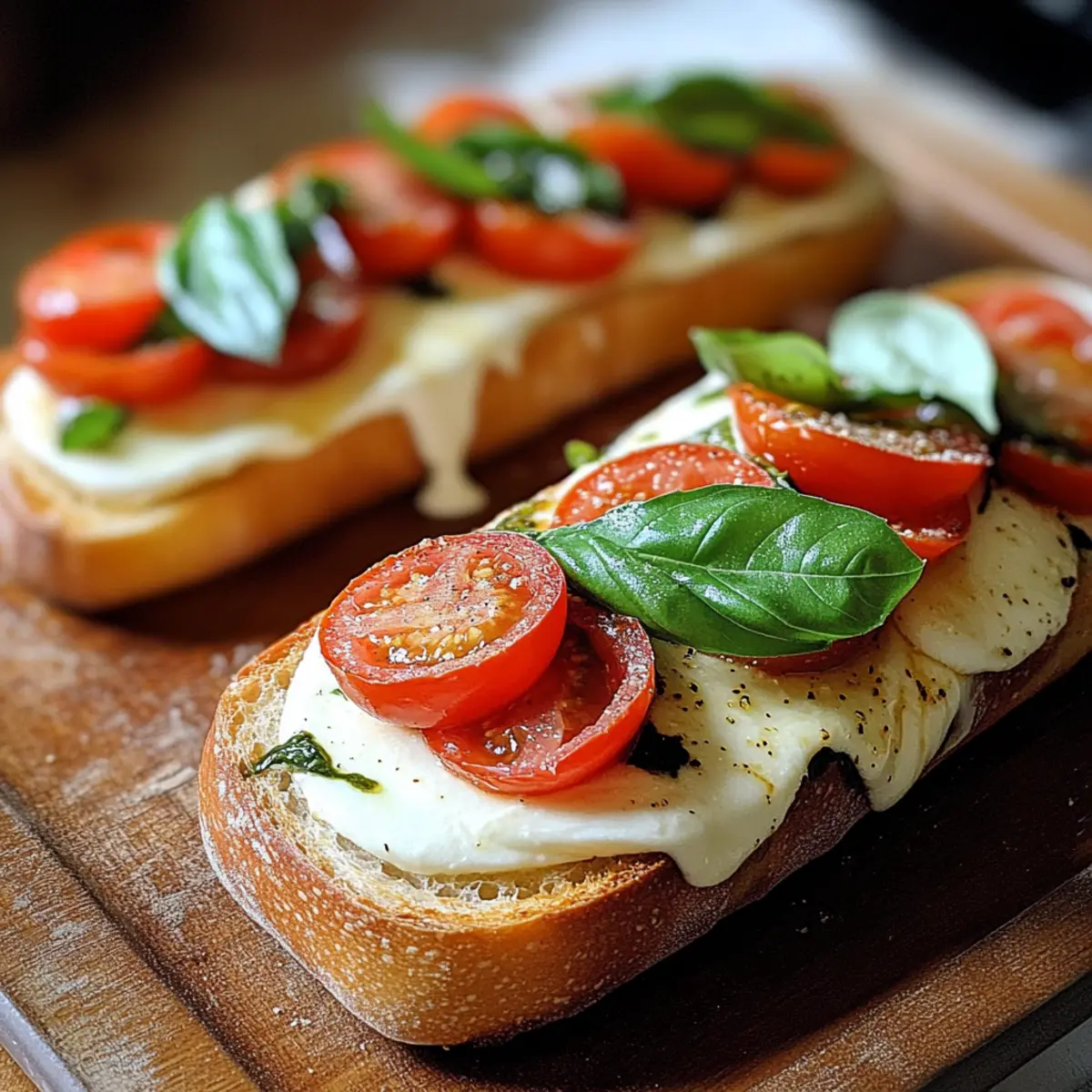 Backe die Baguettehälften auf dem Backblech für 8-10 Minuten im vorgeheizten Ofen. Sie sind fertig, wenn der Mozzarella schön geschmolzen und das Baguette goldbraun und knusprig ist. Achte darauf, dass die Tomaten nicht zerfallen und die Aromen sich vereinen.