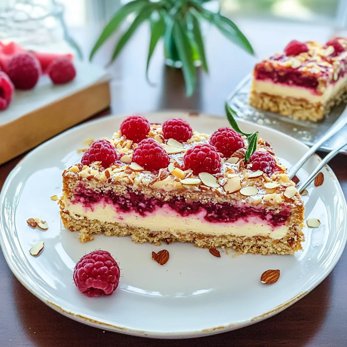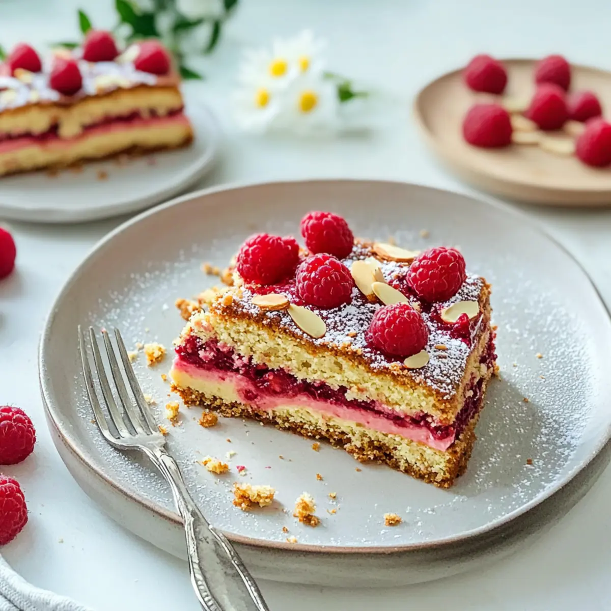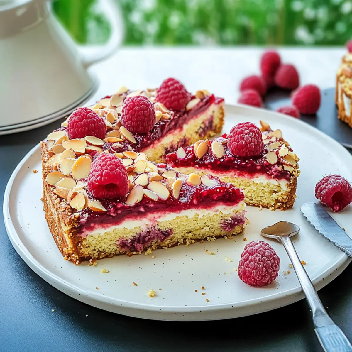 Schneide den Kuchen in gleichmäßige Stücke. Du kannst ihn bei Raumtemperatur oder gekühlt servieren; beide Optionen sind genauso köstlich! Dieser Kuchen bringt frische Aromen auf jede Kaffeetafel und wird deine Gäste mit seiner schmackhaften Kombination aus Himbeeren und Mandeln begeistern.