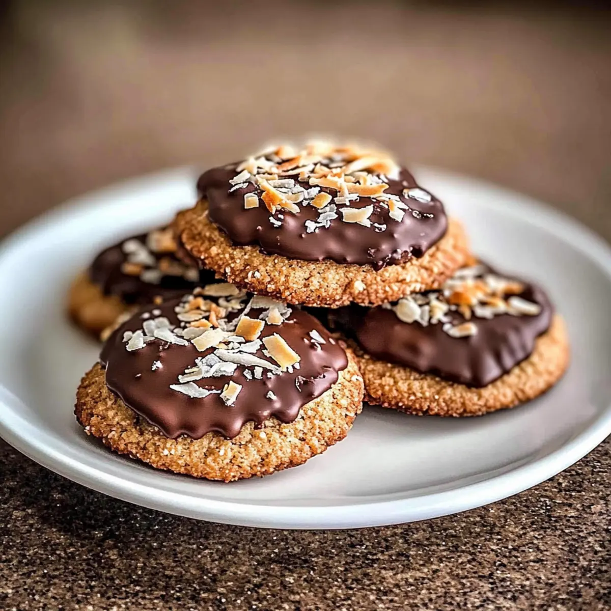 - Abgekühlte Kekse mit geschmolzener Schokolade bestreichen und Kokosflocken darüber streuen.