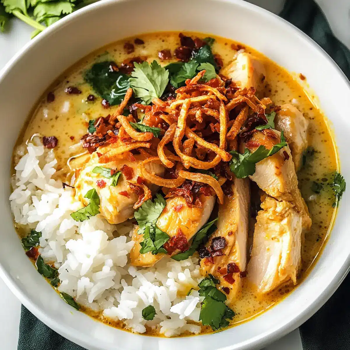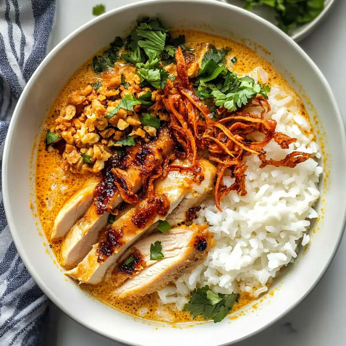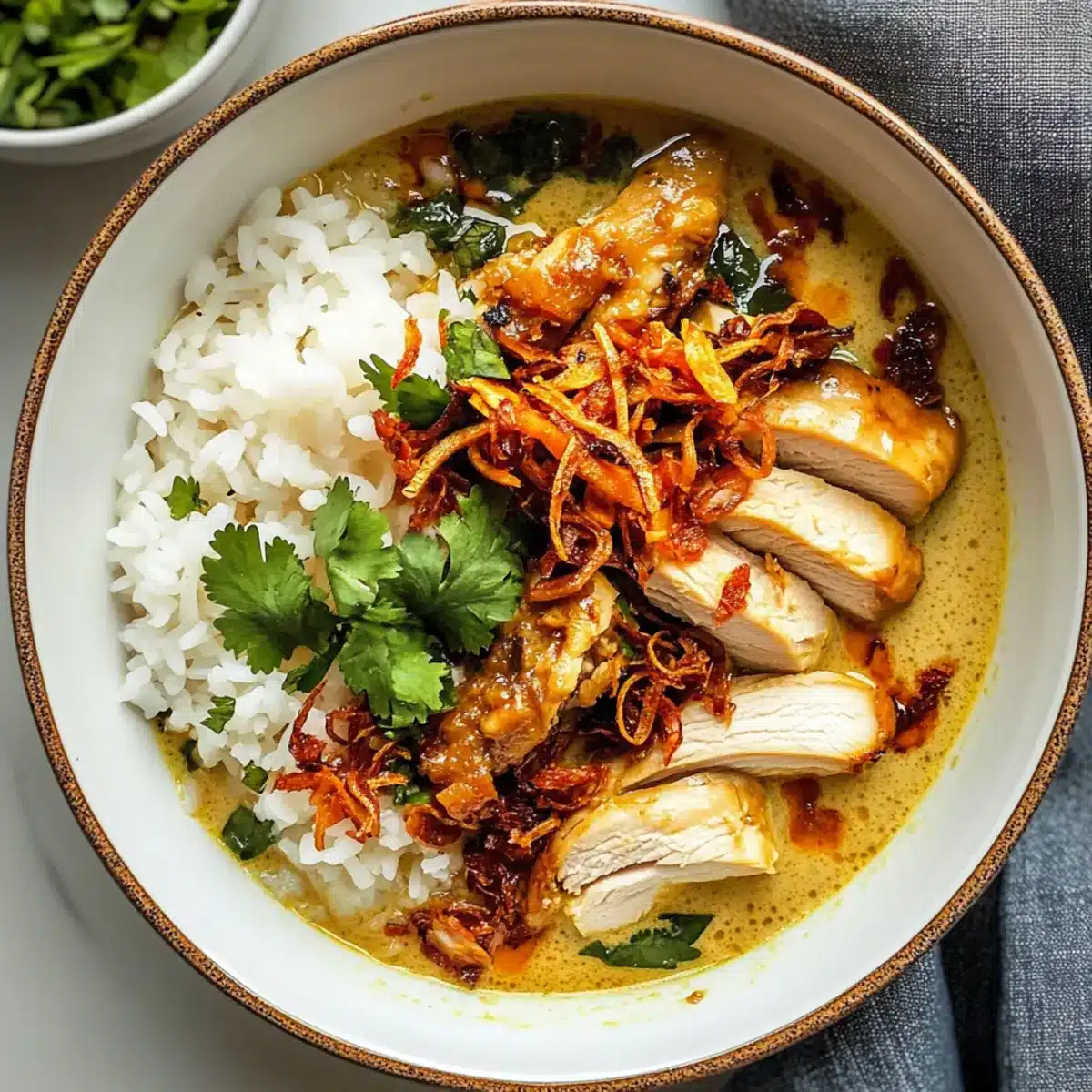 - Schalen anrichten: Gib eine Portion Reis in jede Schüssel, lege gebratenes Hähnchen darauf und gieße die Brühe über das Gericht.